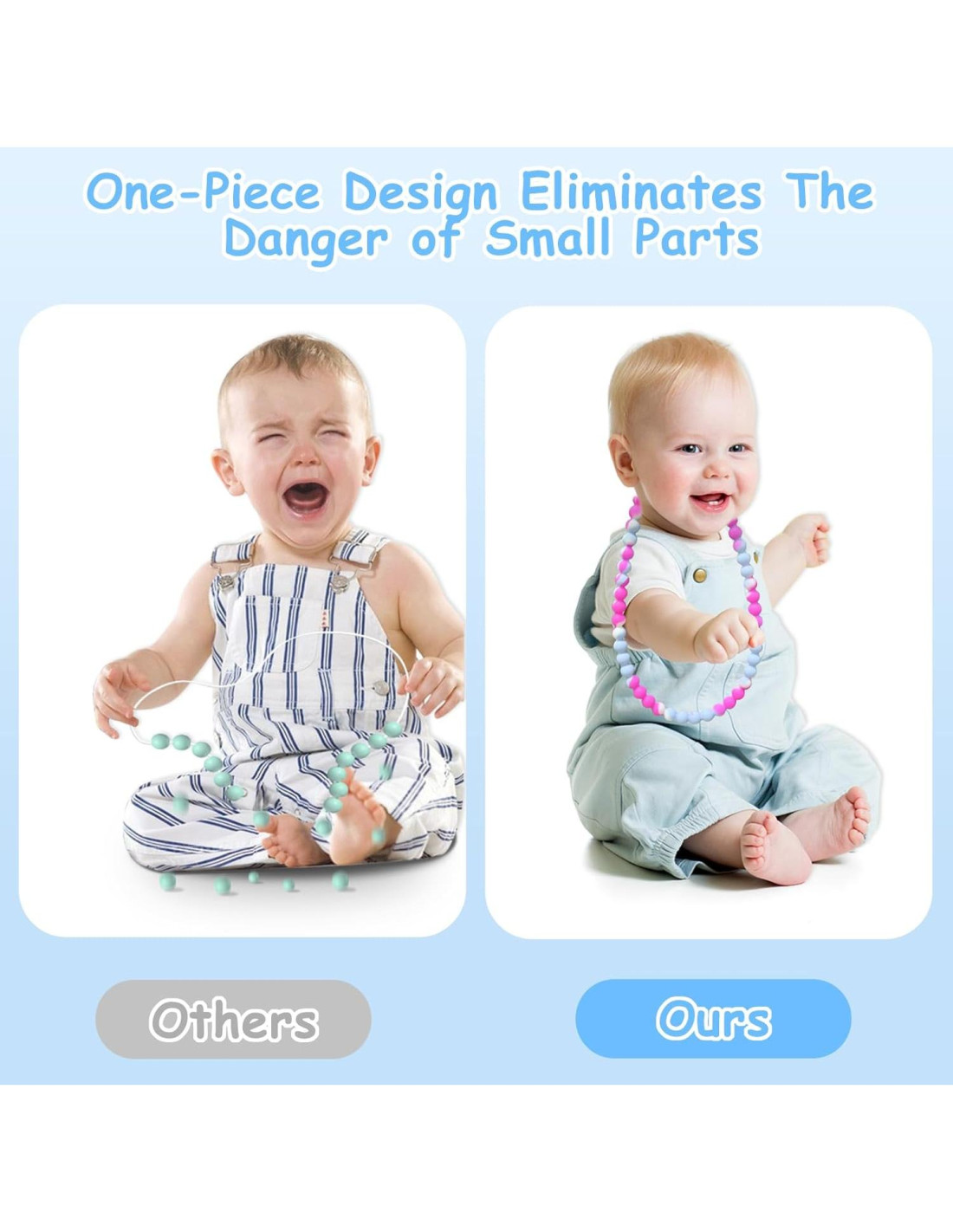 - [Diseño de Seguridad Integrado] Nuestro collar de dentición de silicona cuenta con un diseño integrado y sin costuras que evita que las cuentas se desprendan, eliminando el riesgo de asfixia que presentan los collares de cuentas tradicionales. Mantén a tu bebé seguro mientras mastica y explora.