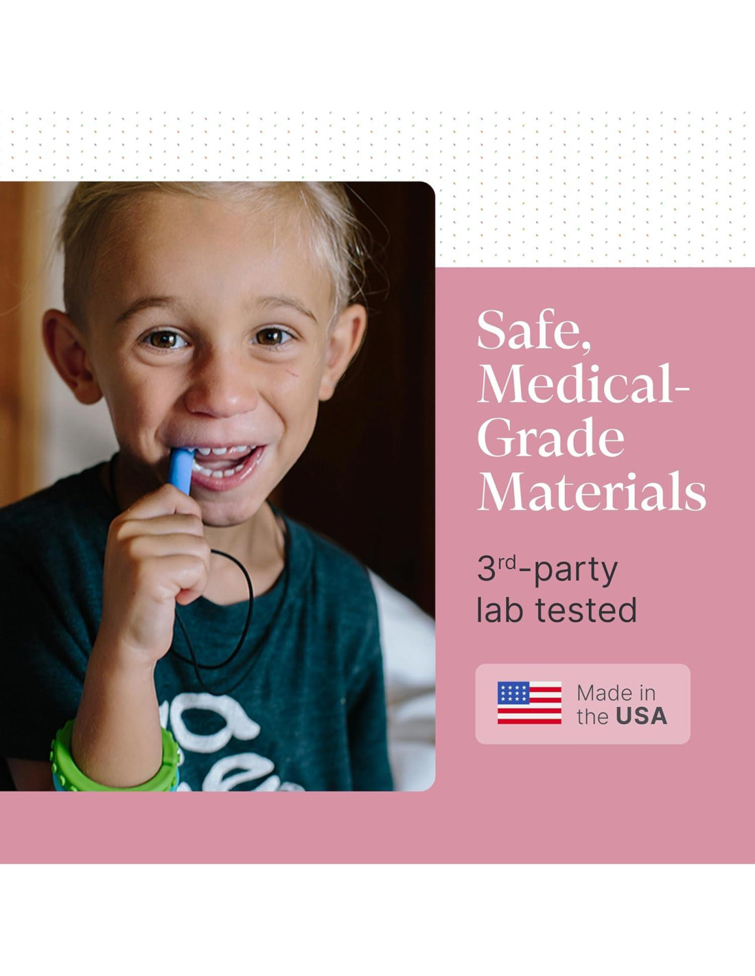 - MATERIALES SEGUROS PARA NIÑOS: Hecho en los EE. UU. con materiales de grado médico y probado por terceros en laboratorios acreditados, nuestros juguetes masticables sensoriales para niños y adultos con necesidades sensoriales ofrecen una alternativa segura a masticar o morder dedos, camisetas, lápices y más.