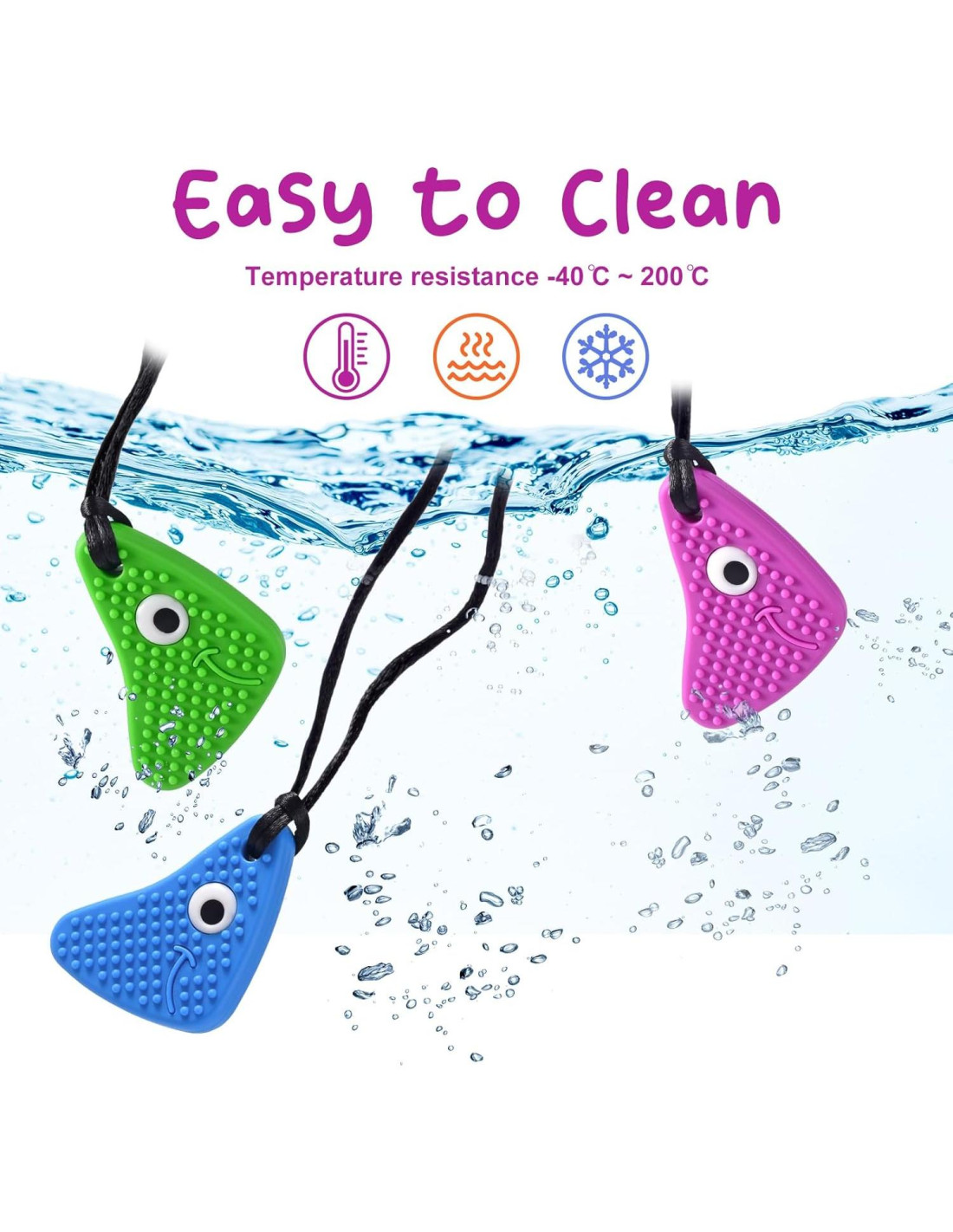 - Diseño de Diente de Tiburón Los collares masticables para niños sensoriales están diseñados en forma de diente de tiburón y tienen diferentes texturas en ambos lados, lo que hace que el collar masticable se vea más genial y atrae la atención de los niños y su disposición a masticar, reduciendo así el mal hábito de masticar dedos, lápices, cabello, ropa, etc.