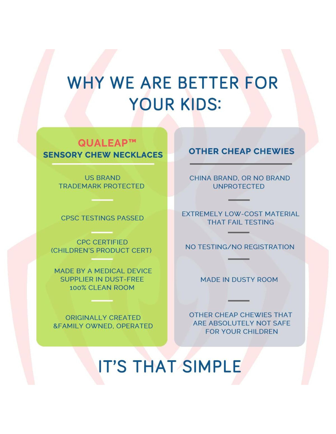 - [MASTICABLE SENSORIAL GENIAL] - ¡A los niños les encanta nuestro diseño exclusivo Spider de QuaLeap Co., Ltd.! El collar masticable ayuda a su hijo a calmarse, tranquilizarse y concentrarse. Especialmente para niños con dentición, autismo o necesidades sensoriales