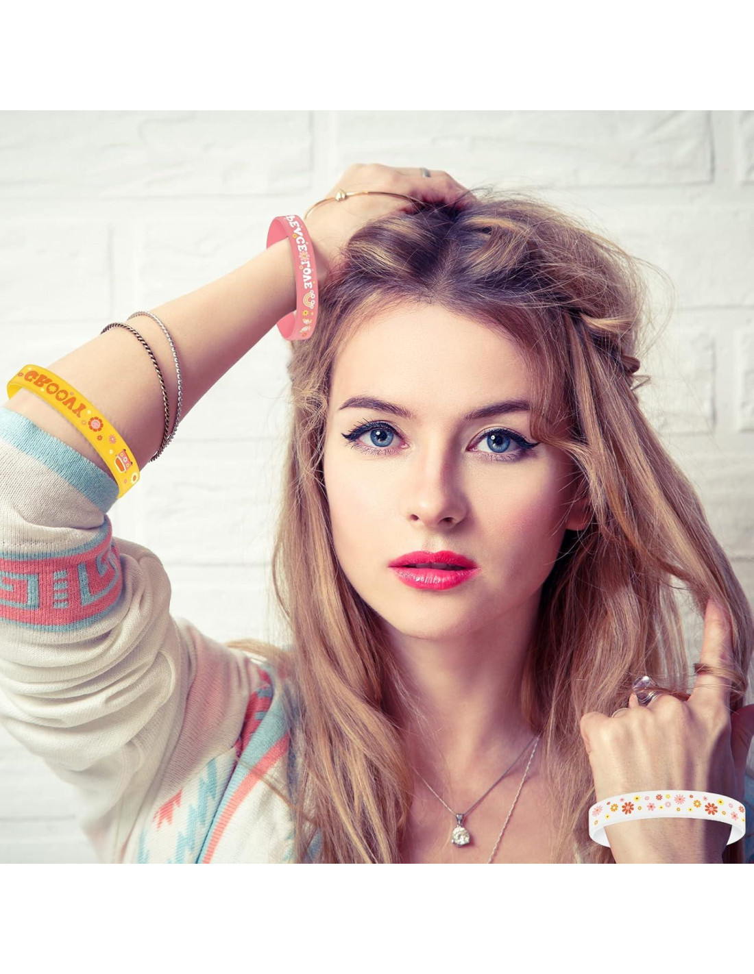 - Diseño Boho Hippie: nuestras pulseras de silicona boho para chicas están diseñadas con temática hippie boho, impresas con flores margarita, autobuses hippies, gestos de victoria, arcoíris, mariposas, y las palabras [Paz], [Amor] y [STAY GROOVY], adorables y vívidas, que pueden hacerte más encantador y destacar entre la multitud.