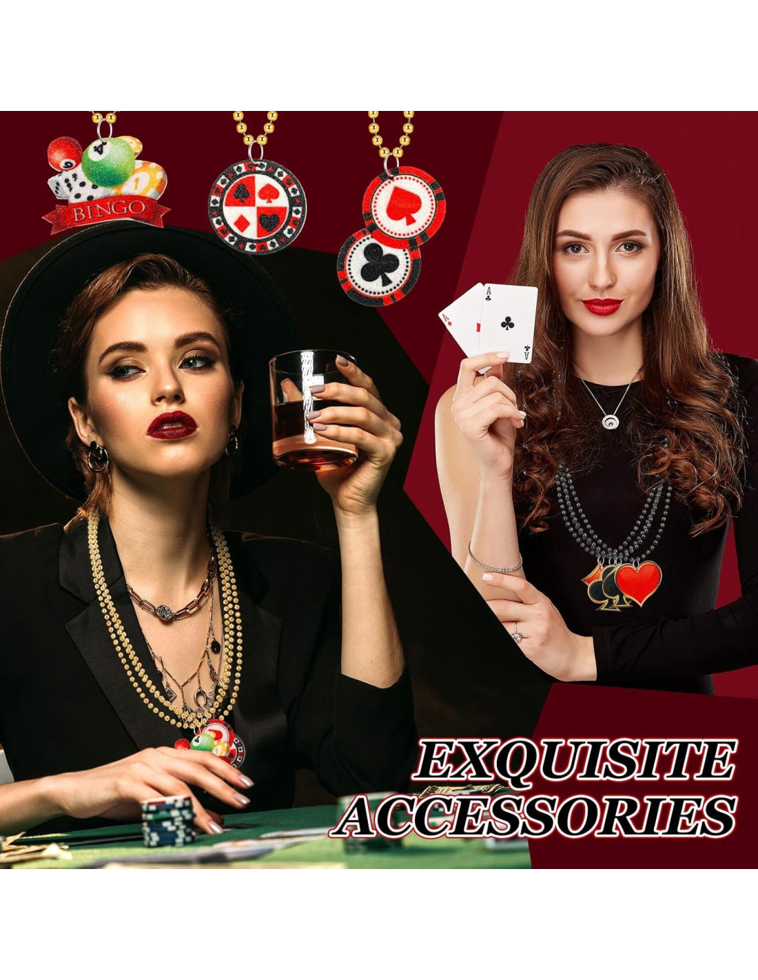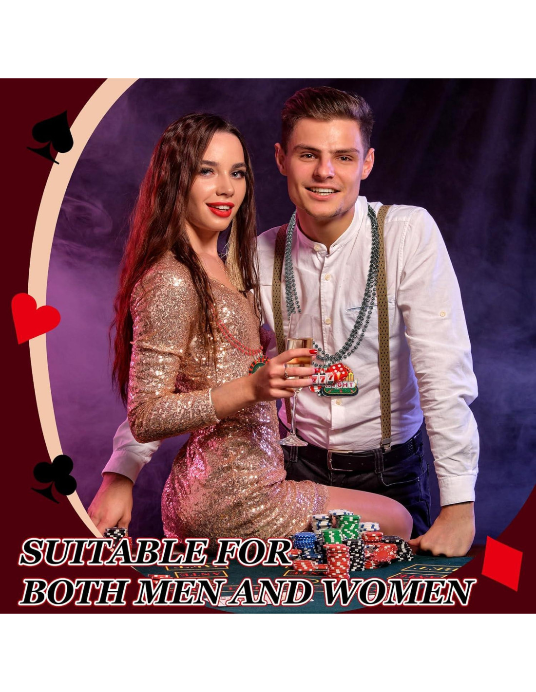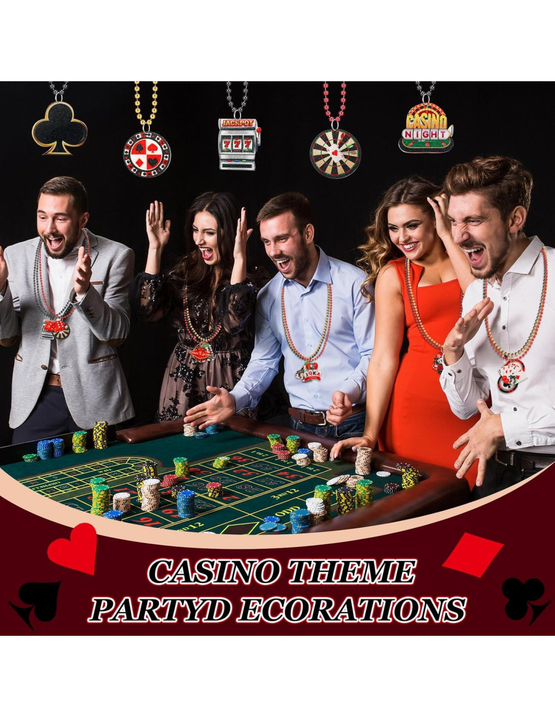- Diseño temático de casino: estas cuentas de casino están diseñadas en varios colores e impresas con elementos de casino en motivos de póker; El divertido diseño puede agregar diversión interminable a tu fiesta, y este collar es tu artículo imprescindible para la fiesta de casino