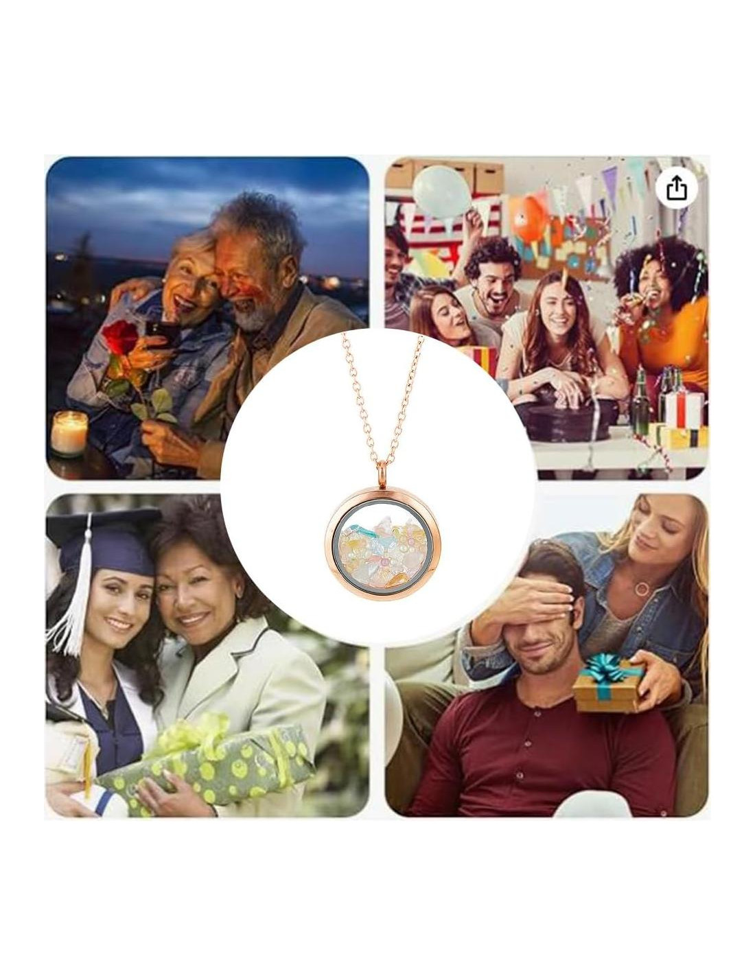 - Locket de Memoria: Los colgantes están hechos de vidrio claro para hacer visible el interior. Puedes llenarlo con tus cosas favoritas. Puede hacer que el cierre del colgante sea más ajustado, no es fácil que se caiga. El colgante tiene anillos pequeños que se pueden colgar alrededor del cuello como un collar o usar como llavero.