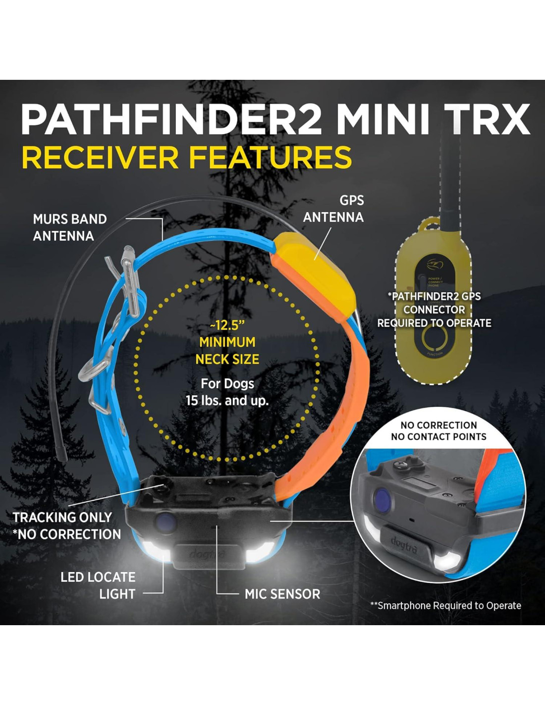 - SUÉLTALOS: El RECEPTOR ADICIONAL PATHFINDER2 MINI TRX es un rastreador solo GPS con la mejorada app de seguimiento en tiempo real Dogtra PATHFINDER2. Explora más y rastrea hasta 21 perros en tiempo real con Dogtra PATHFINDER2 MINI. El nuevo PATHFINDER2 MINI NO es compatible con la serie PATHFINDER. Se requiere Conector GPS PATHFINDER2 y Smartphone para operar. *El Conector GPS PATHFINDER2 no está incluido y es necesario para operar.