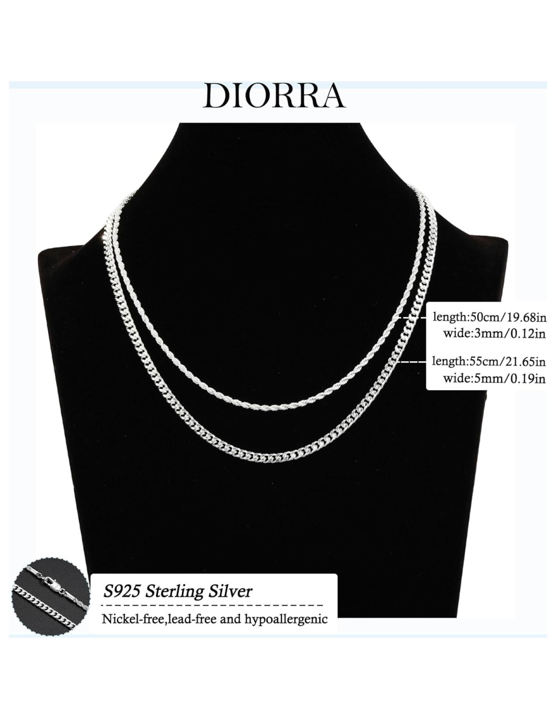 - Collar de Plata con Opciones de Tamaño Múltiple: Estas 2 piezas de cadenas están disponibles en anchos: 2mm, 3mm, 4mm, 5mm, y dos longitudes: 20pulgadas (50.8cm), 22pulgadas (55.88cm), este collar de plata para hombres ofrece un ajuste perfecto para cada estilo. Usa solo o combina con tu colgante favorito, moderno y elegante, muestra tu declaración personal, o como una gran cadena para superponer.