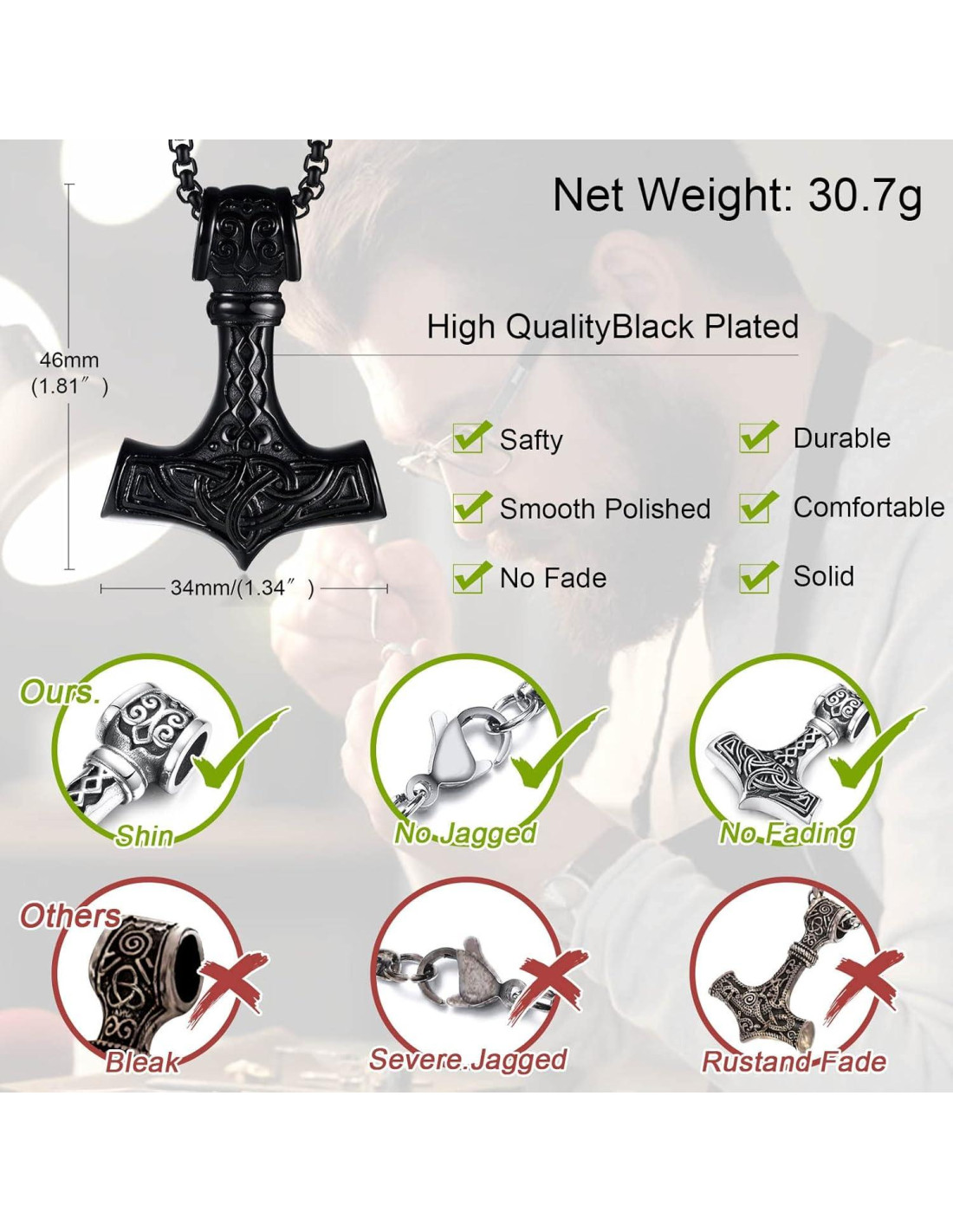 - [Material del Producto]: El colgante del collar de martillo de Thor para hombres está hecho de acero inoxidable de alta calidad, que no se oxida ni corroe, con un pulido fino y duradero. El collar vikingo es muy cómodo de llevar, sin plomo ni níquel, sin reacciones alérgicas. La longitud del colgante es de 46 mm, el ancho es de 34 mm y el peso del colgante es de 31 g. La longitud de la cadena es de 24 pulgadas (61 cm), adecuada para todos.