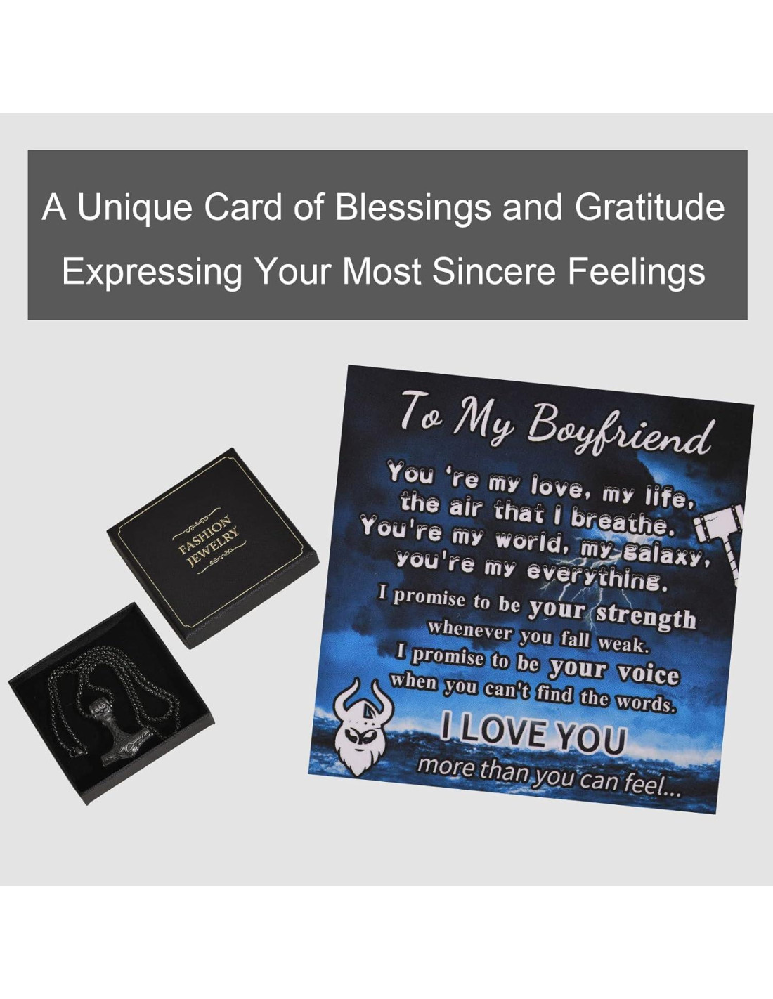 - [Tarjetas Únicas]: Tenemos tarjetas únicas para cada hombre, para tu novio, esposo, padre, abuelo, hermano o nieto. El contenido de las tarjetas varía de persona a persona, pero todas contienen deseos y palabras dulces. El collar de martillo de Thor con tarjetas especiales y cajas de regalo son una elección perfecta para regalos.