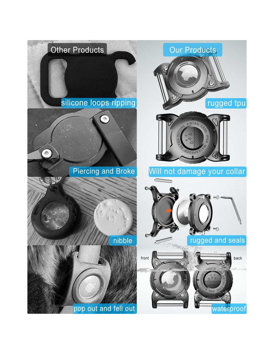 - Protección Sólida de TPU 360: El soporte para collar de perro Airtag con material TPU duro cubre todo el cuerpo y es a prueba de golpes contra caídas de hasta 15m (49 pies) de altura. El collar de perro Airtag brinda protección completa a tu AirTag.