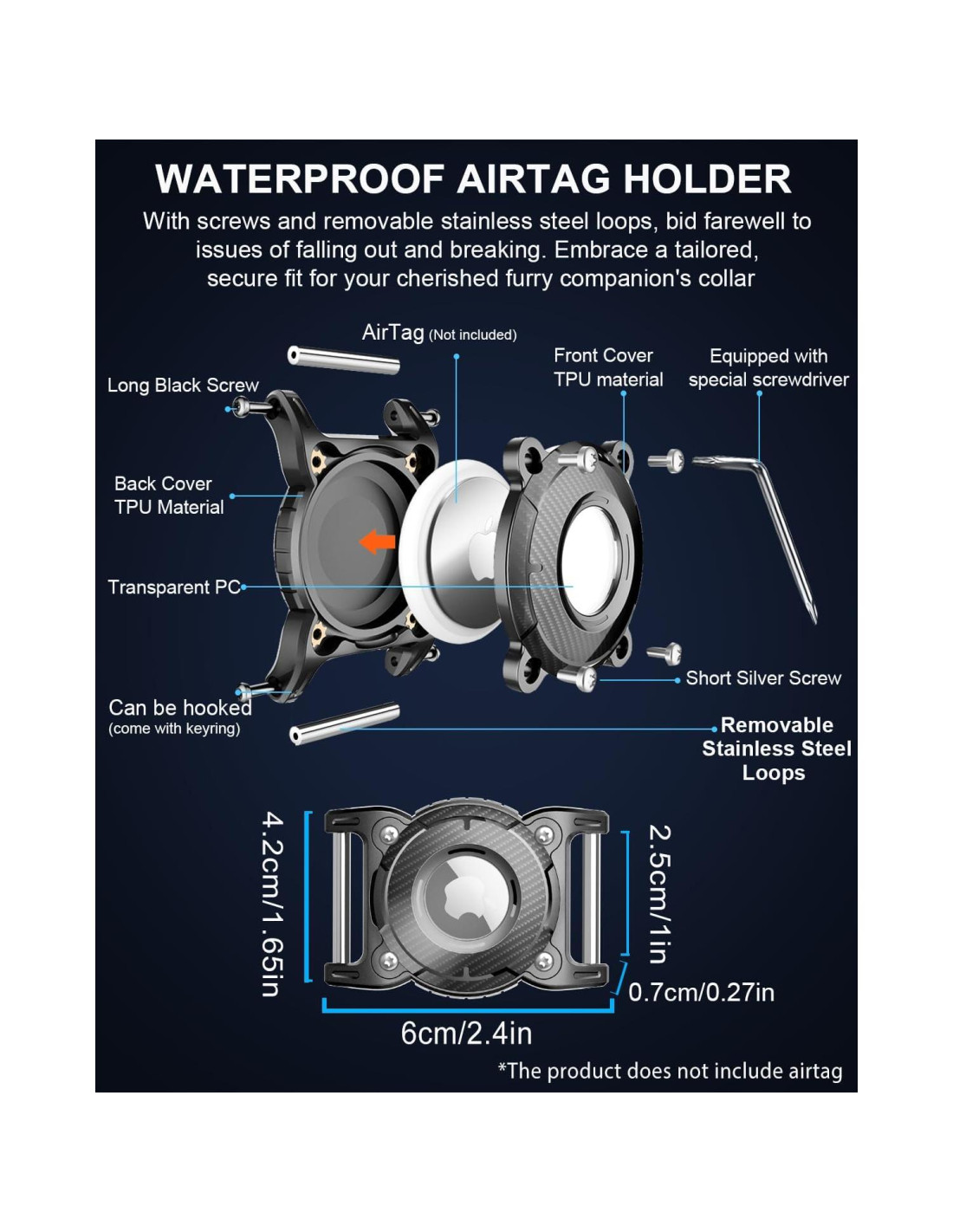- Soporte para Collar de Perro Airtag de Tamaño Compacto: El soporte para collar de perro Airtag viene con un llavero, puedes adjuntar el perro airtag a la llave de tu coche, tu bolso, niños, mascotas, collar de perro, gato, los objetos de valor y más. (Observaciones: Ancho del agujero interior 2.7cm, adecuado para cuerda de 2.7cm. El soporte Airtag para collar de perro es relativamente ligeramente grande y adecuado para perros de tamaño mediano a grande.)