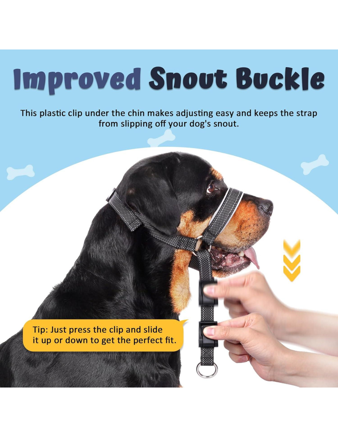 - Diseño Cómodo: La correa para hocico de perro viene con almohadillas suaves para la nariz, por lo que no tienes que preocuparte de que la nariz de tu perro se raspe. El acolchado suave en el collar de cabeza para perros sin tirones está cuidadosamente diseñado para asegurar que tu mascota esté cómoda durante paseos y entrenamientos.