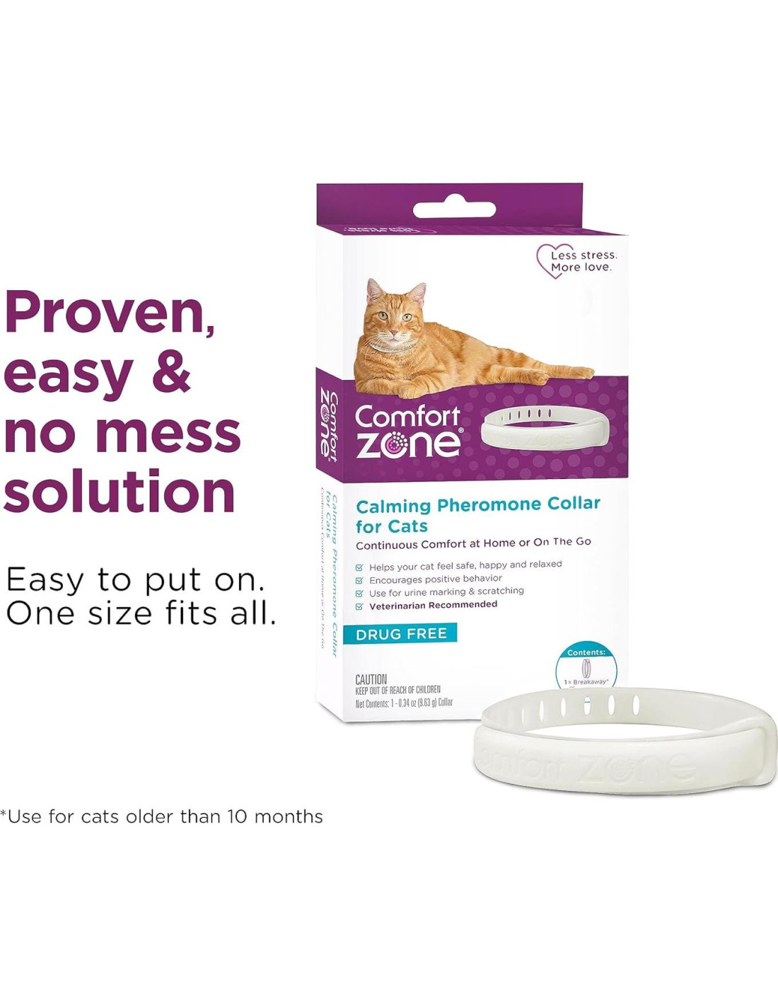 ¿Tu gato rasca los muebles o los marcos de las puertas? Estos son signos de un gato estresado. Nuestro collar calmante para gatos imita las feromonas calmantes naturales de tu gato para señalar que el área es segura y familiar. Sentirse seguro calma a tus gatos y reduce sus comportamientos destructivos relacionados con el estrés. El collar calmante para gatos es libre de drogas y es ideal para calmar a los gatos todos los días, limitando el comportamiento relacionado con el estrés, presentando nuevos gatos, viajando, visitas al veterinario o mudándose a un nuevo hogar. La mayoría de los gatos mostraron un comportamiento mejorado en 1-2 semanas. Comfort Zone tiene una línea completa de productos calmantes para gatos, incluyendo difusores calmantes para gatos, difusores calmantes para múltiples gatos y sprays de feromonas para gatos. Los collares calmantes para gatos están disponibles en paquetes de 1, 2 y 4.