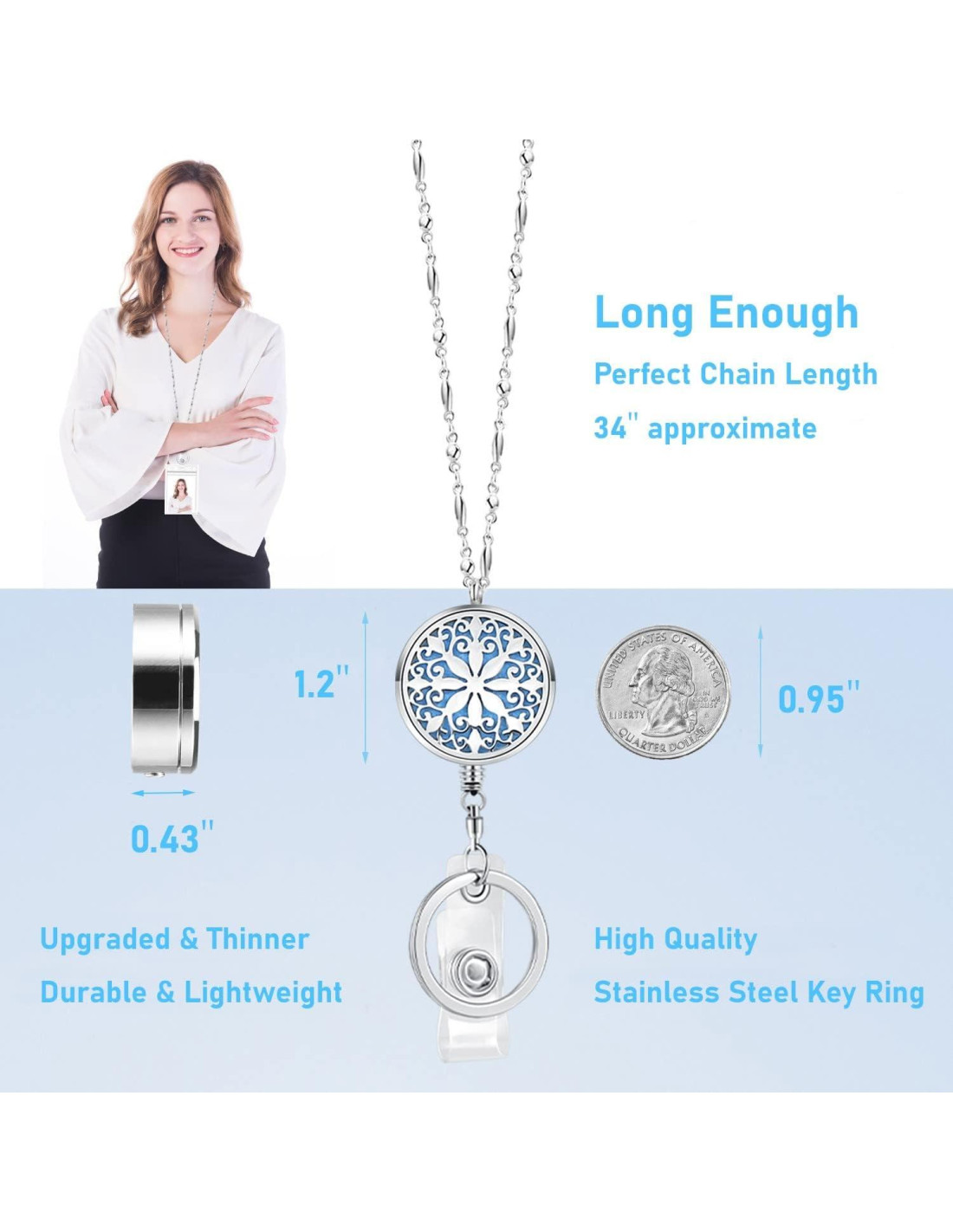 - [Significativo y Retráctil] Este collar mandala nos ayuda a acceder a una fuente creativa más profunda que va más allá de la lógica y el orden, y entra en el misterio, la creatividad y la intuición. Más atractivo es que el cable retráctil de 25" (63.5 cm) del portador de identificación es perfecto para usar la identificación / llaves para acceder a puertas y no tienes que quitártelo todo el tiempo. Mientras tanto, también es un collar difusor simple pero lindo. Puedes mantener tu aceite favorito cerca de ti en todo momento para relajarte durante el trabajo.