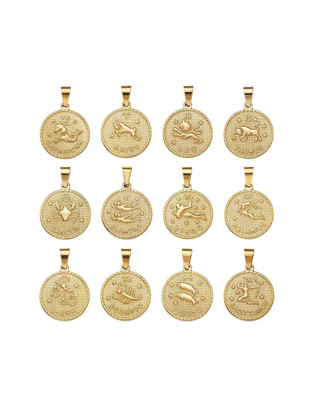 - [ Característica ] Estos colgantes de signo zodiacal de 12 constelaciones están hechos de acero inoxidable 304, que es de alta calidad y duradero. El color dorado aporta a los colgantes un brillo y singularidad. Un diseño exquisito y clásico combinado con diferentes cuerdas dará como resultado collares excelentes con una fuerte singularidad.
