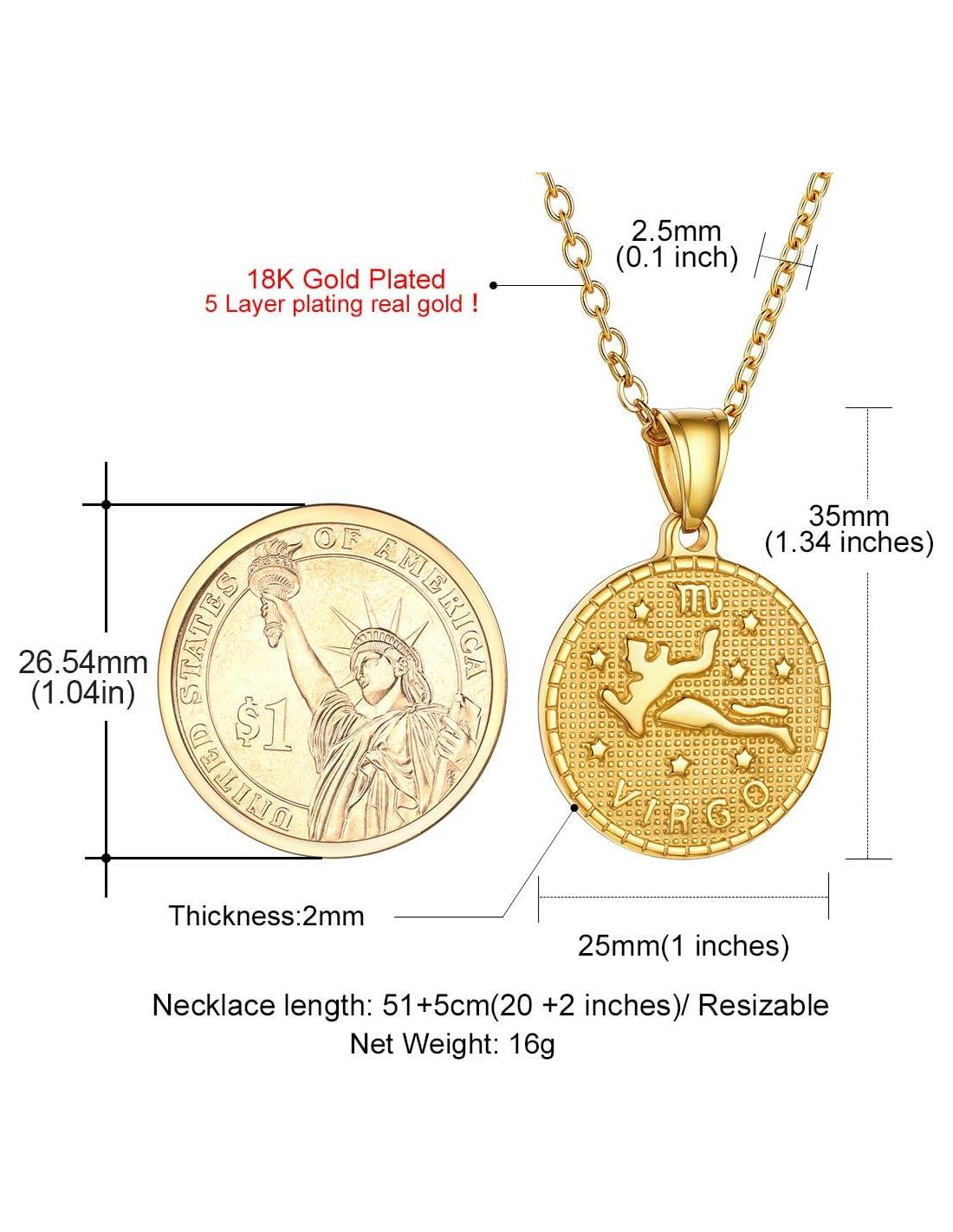 - TAMAÑO---Diámetro del colgante: 25mm, Longitud de la cadena Rolo: 20+2 pulgadas (50.8+5.08 cm) (ajustable), Ancho de la cadena: 2.5mm, Una delicada moneda zodiacal personalizada cuelga de una delicada cadena chapada en oro de 18K, haciendo una declaración simple pero elegante. La pieza perfecta para superponer o un collar minimalista.