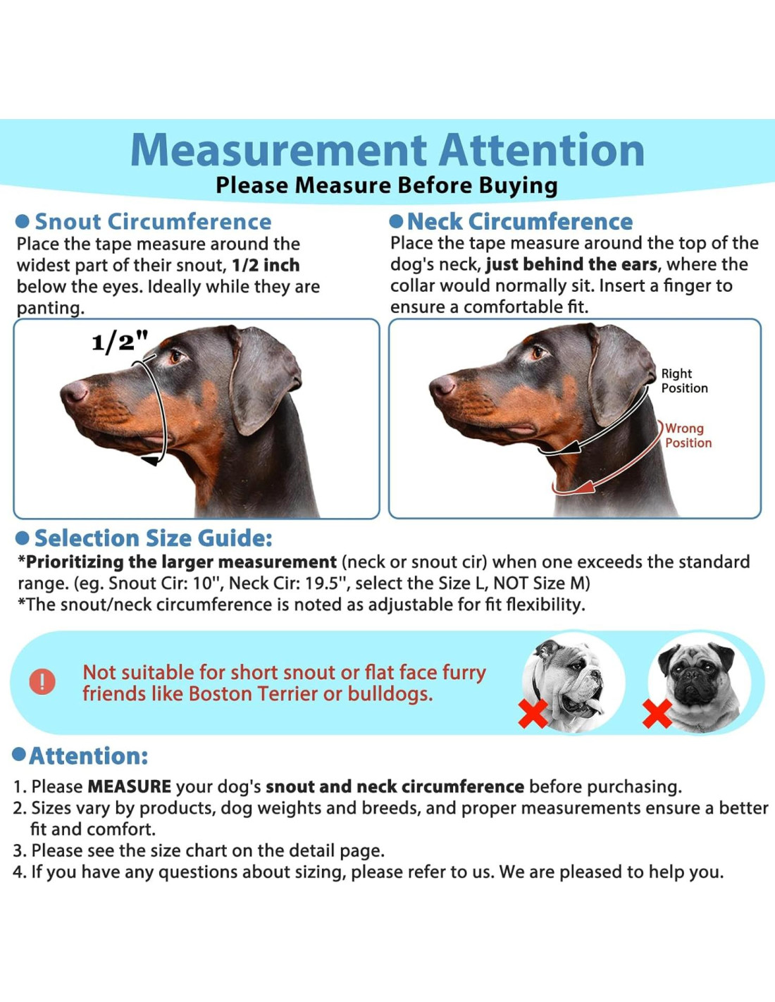- Elige el Tamaño Correcto: Las correas de bozal sin tirones no son adecuadas para razas de hocico corto como boxers, pit bulls y bullies. Por favor, mide a tu perro cuidadosamente y verifica la tabla de tamaños antes de ordenar. Puedes encontrar la tabla de tamaños del arnés de nariz sin tirones para perros medianos y una guía paso a paso de ajuste en las imágenes y la descripción. Si tienes alguna pregunta sobre el tamaño, eres bienvenido a proporcionar el tamaño de tu perro, y te ayudaremos a elegir un tamaño ideal para tu perro