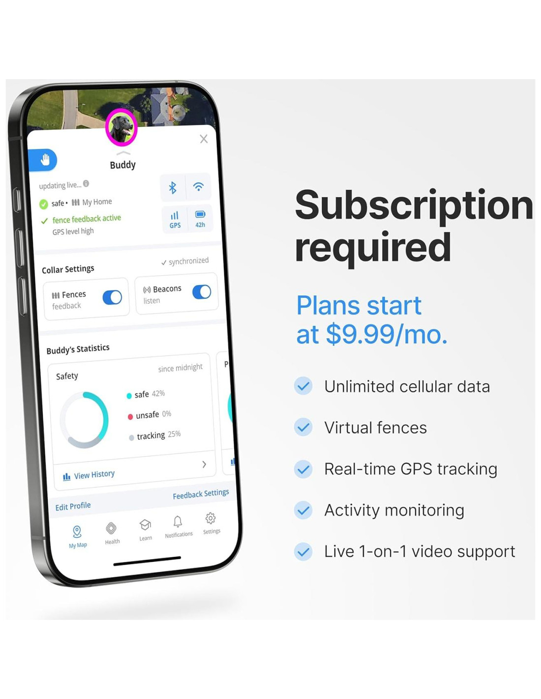 - SUSCRIPCIÓN REQUERIDA: Tu collar necesita servicios GPS y datos celulares para crear, editar y usar las cercas inalámbricas para perros y el seguimiento GPS. Los planes de membresía comienzan en $9.99 por mes. Selecciona un plan después de la compra