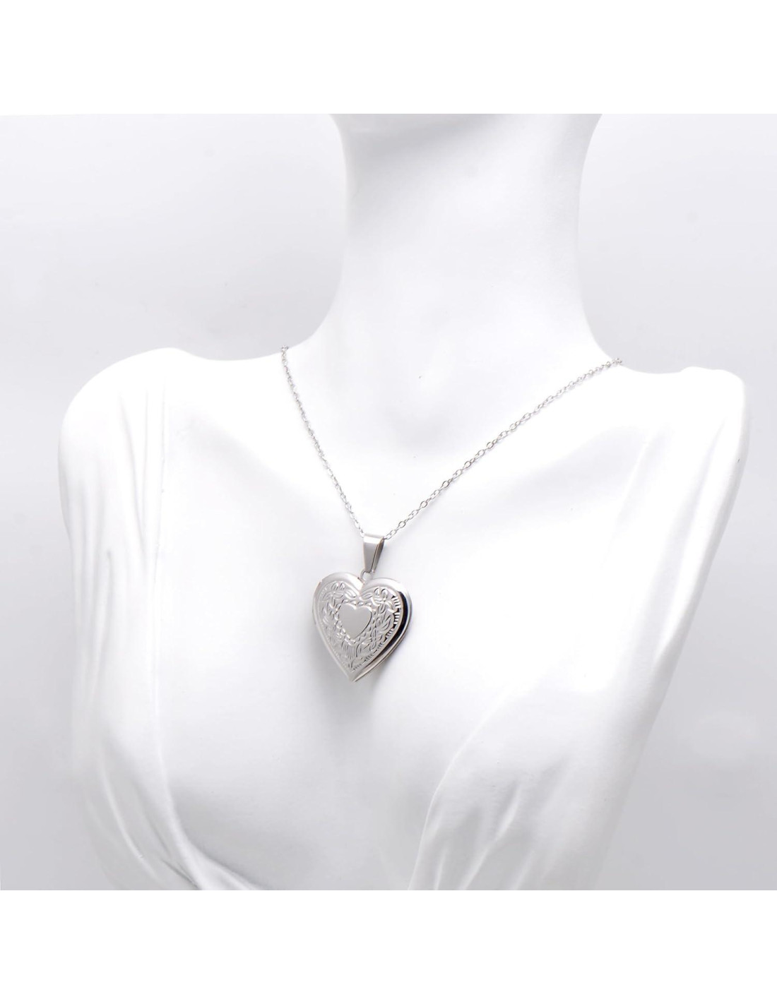 - Es un gran colgante de corazón, metal de acero pulido brillante color blanco; El lado frontal está grabado con patrones de flores reales, un pequeño corazón está en el centro