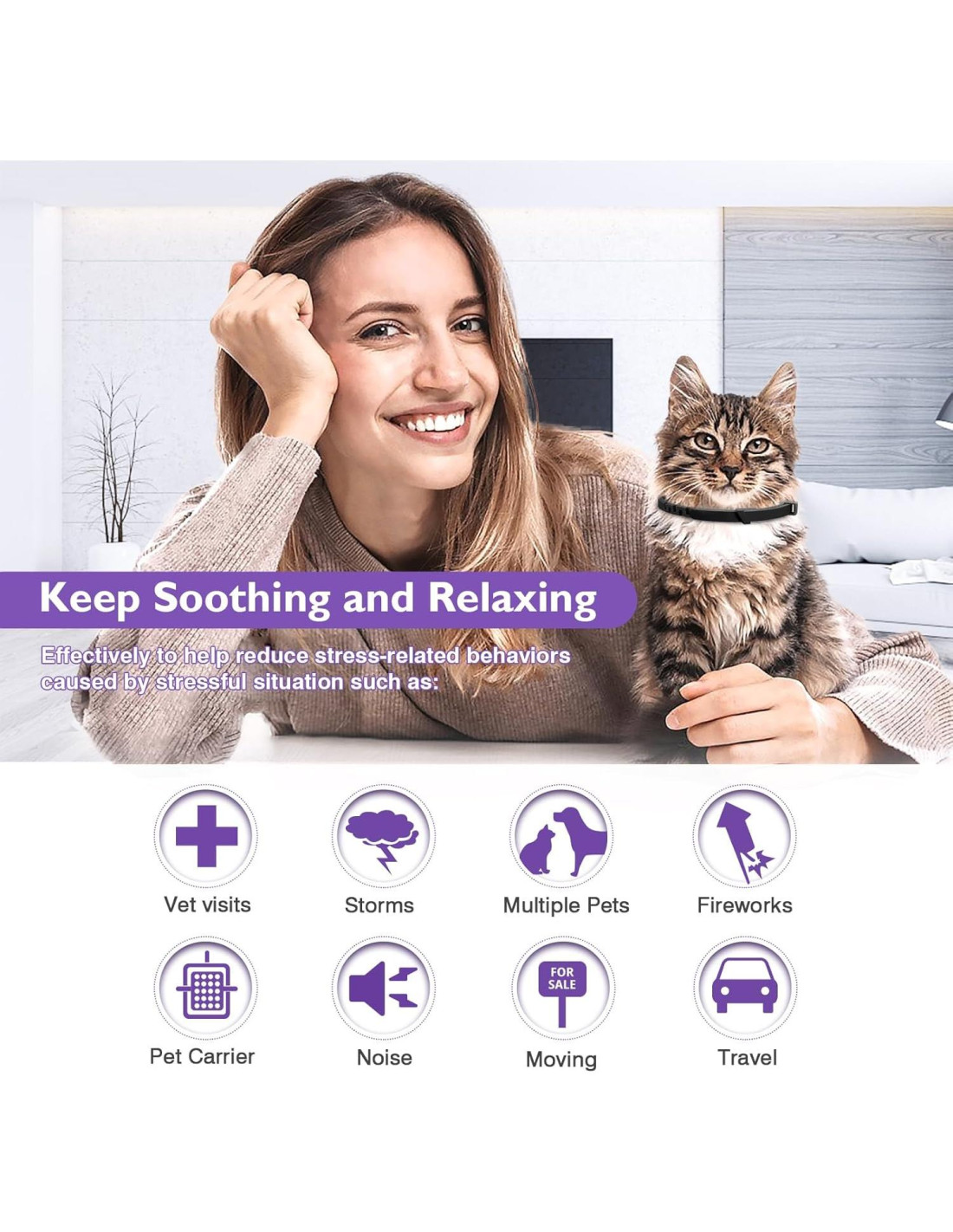 - Mejora Rápidamente el Mal Comportamiento El collar de ansiedad para gatos puede comenzar a funcionar dentro de 1 hora y liberar continuamente feromonas, lo que alivia efectivamente el miedo o el estrés por alta temperatura, ruido, tráfico, viajes, visitas al veterinario, soledad de la mascota, fuegos artificiales, tormentas, ansiedad por separación. Ayuda a los gatos a adaptarse a entornos desafiantes