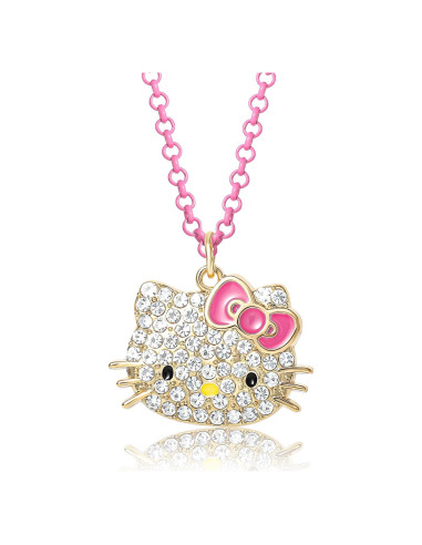 - Collar Colgante de Hello Kitty con Licencia Oficial: El auténtico collar de Hello Kitty presenta una cadena de neón rosa vívido y un colgante de Hello Kitty llamativo adornado con cristales pave.