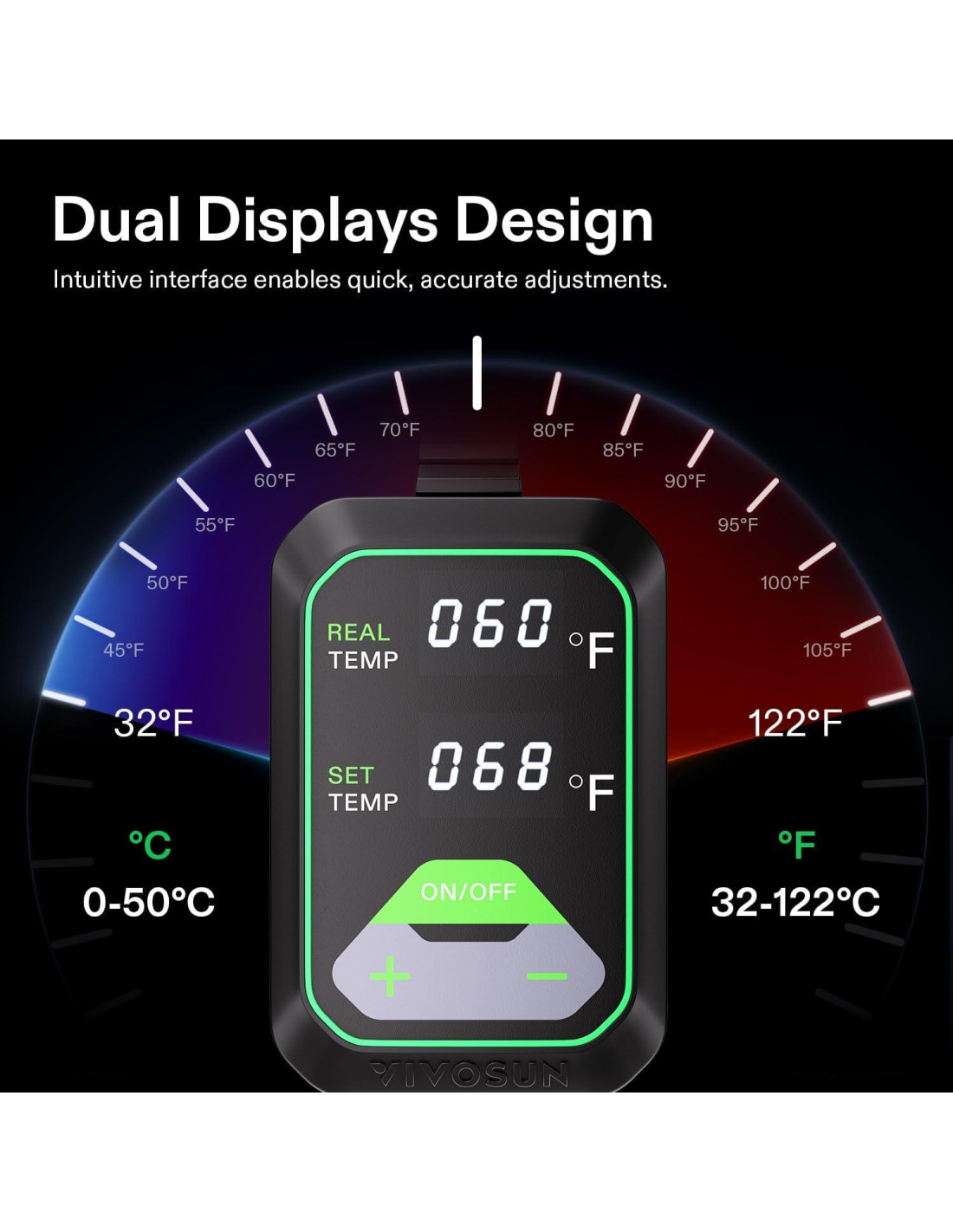 - Pantalla Digital Doble: Este termostato viene con una función de ajuste que permite a los usuarios establecer la temperatura deseada según las necesidades de sus plantas; es simple y conveniente de usar; También recibe datos del chip sensor interno y muestra la temperatura de la almohadilla térmica en tiempo real