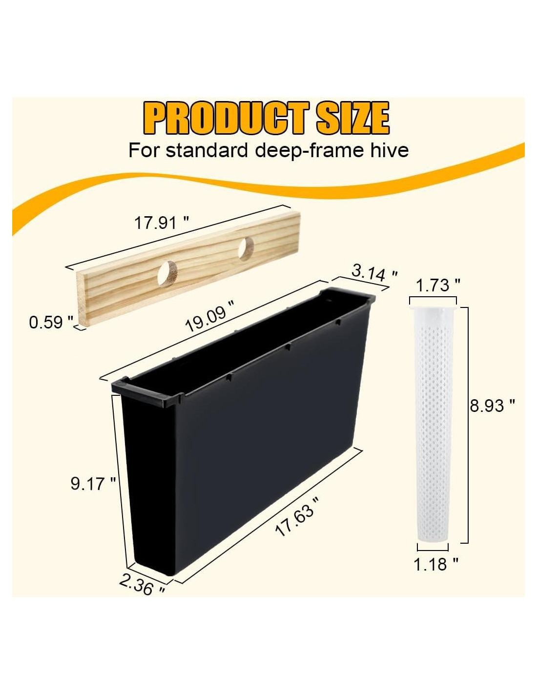 - Especificaciones del Producto - El Alimentador de Marco mide 19" (48,26 cm) x 3.14" (7,99 cm) x 8.46" (21,5 cm) (L x W x H) para cajas de marco profundo estándar. Hay dos alimentadores de abejas en el paquete para que los reemplace.