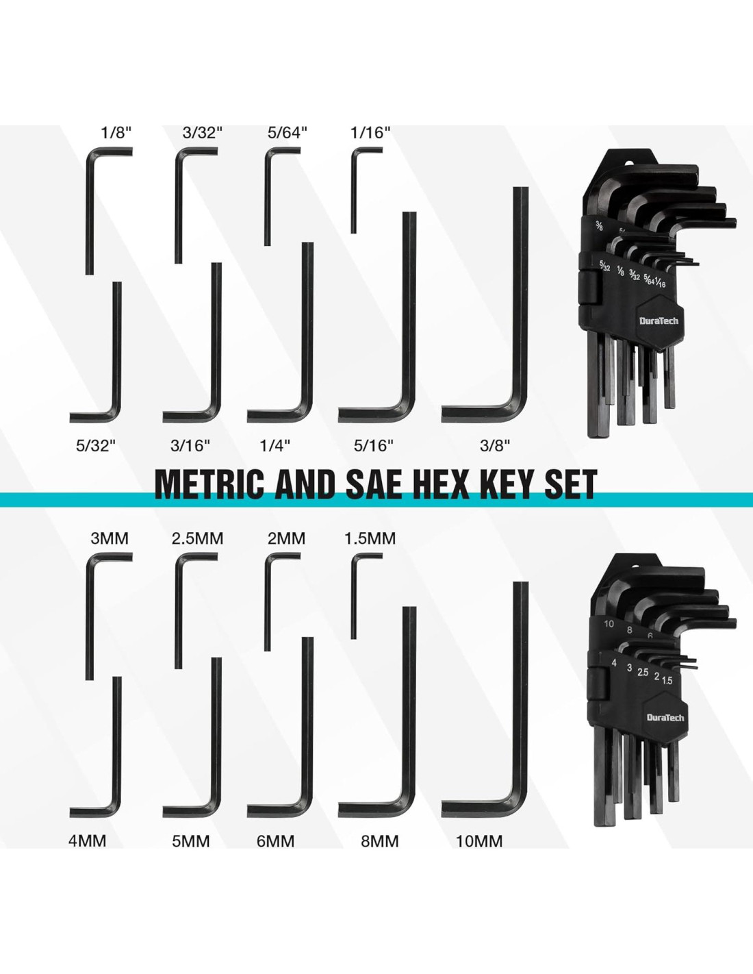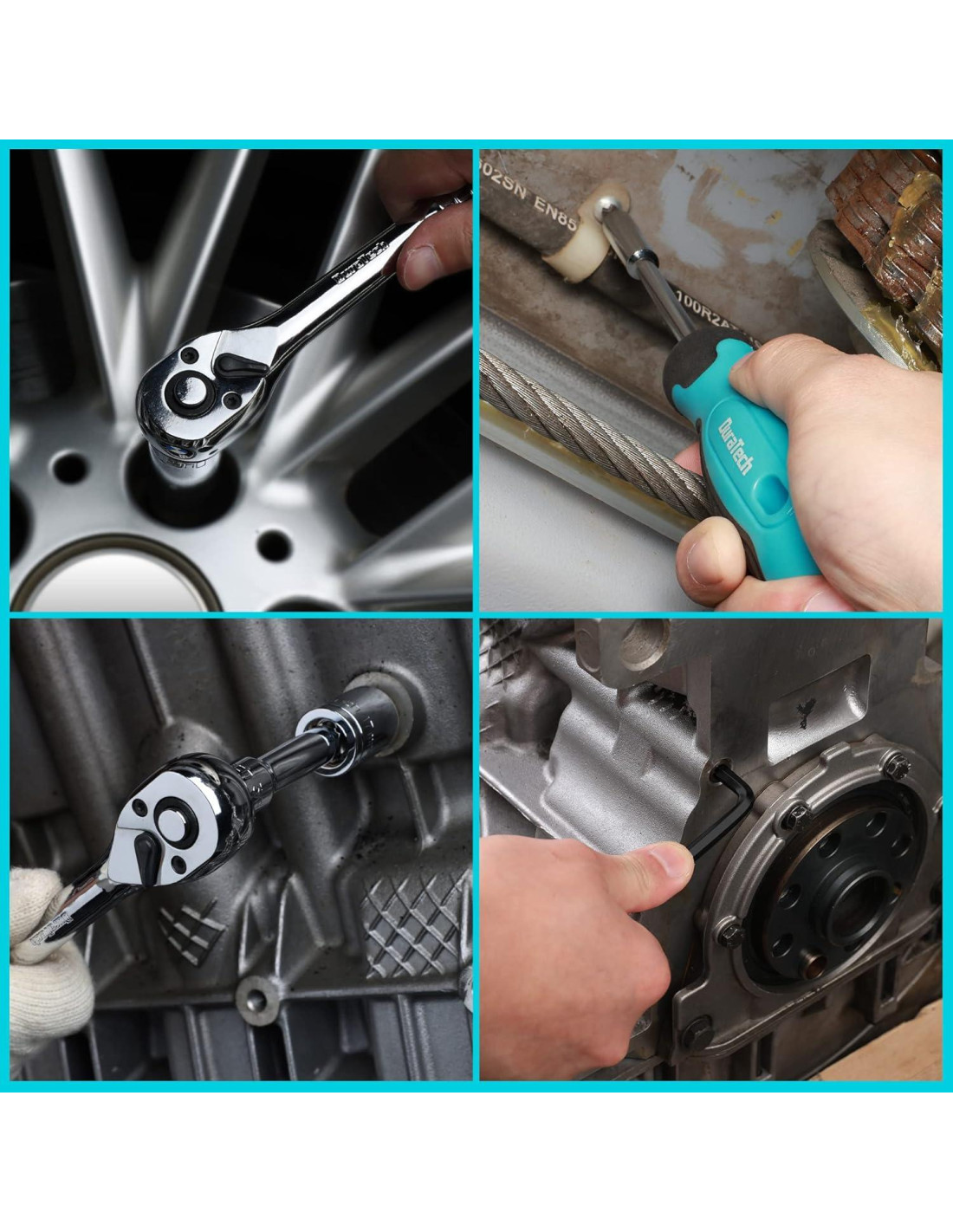 - Una Gran Relación Calidad-Precio: El juego de herramientas mecánicas DURATECH de 121 piezas incluye 47 enchufes métricos y SAE con carracas reversibles de 1/4 de pulgada (0,64 cm) y 3/8 de pulgada (0,95 cm), 2 varillas de extensión, 1 adaptador, 1 acoplador de 1/4 de pulgada (0,64 cm), 1 destornillador magnético con 40 puntas, 10 puntas para tuercas, 18 llaves hexagonales y 1 caja de herramientas. Tiene casi todo lo que necesitas para completar una amplia variedad de tareas automotrices