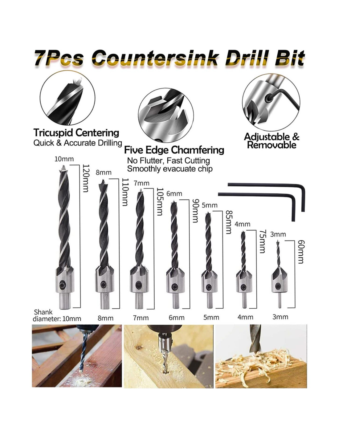 - 7 Piezas de Brocas de Avellanado para Madera - Hechas de acero de alto carbono con alta dureza y resistencia a la abrasión, gran flauta de viruta y cinco chaflanes de borde pueden drenar el aserrín más rápido y más fácil (Tamaño - 3mm, 4mm, 5mm, 6mm, 7mm, 8mm, 10mm). Con 1 llave hexagonal, puedes quitar y ajustar fácilmente la profundidad del manguito de contragolpe y la profundidad de perforación.