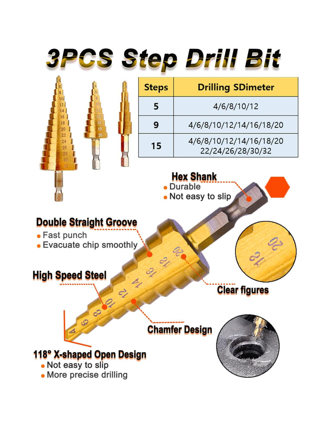 - 3 Piezas de Juego de Brocas Escalonadas HSS de 1/4" - Gran resistencia al calor/corrosión/óxido con recubrimiento de titanio. Especificación: 4-12mm / 4-20mm / 4-32mm. Adecuado para perforar agujeros en placa de hierro, placa de cobre, placa de aluminio, madera, lámina de PVC, tableros de aislamiento. No se recomienda para materiales duros y quebradizos como vidrio, baldosas, pisos, paredes, etc.