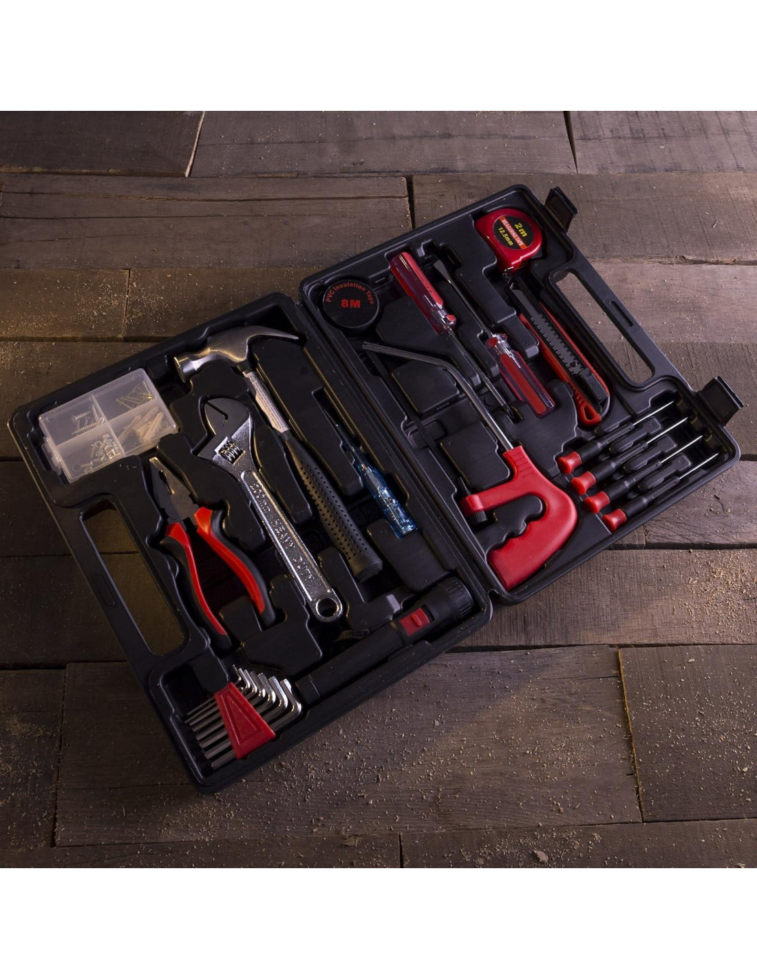 - Componentes incluidos: Martillo de 9 oz (255 g), Alicates de Punta Redonda de 6.5" (16,51 cm) / Cortador de Alambre, Llave Ajustable de 8" (20,32 cm), Probador de Voltaje de 5" (12,7 cm) 100-500V, Juego de Tornillos, Clavos, Anclajes para Paredes Secas y Arandelas, Linterna de 5.75" (14,61 cm) (Requiere 2 Baterías AA - No Incluidas), Sierra de Mano Mini de 9.5" (24,13 cm) (La hoja mide 6" (15,24 cm)), Destornillador de Cabeza Phillips de 7" (17,78 cm), Destornillador de Cabeza Plana de 7" (17,78 cm), 2 - Destornilladores de Precisión de Cabeza Plana de 5" (12,7 cm), 2 - Destornilladores de Precisión de Cabeza Phillips de 5" (12,7 cm), Cortador de Caja de 6" (15,24 cm), Cinta Métrica de 80 inches (203,2 cm), 8 Llaves Hexagonales Métricas (1.5mm, 2mm, 2.5mm, 3mm, 4mm, 5mm, 5.5mm, 6mm)