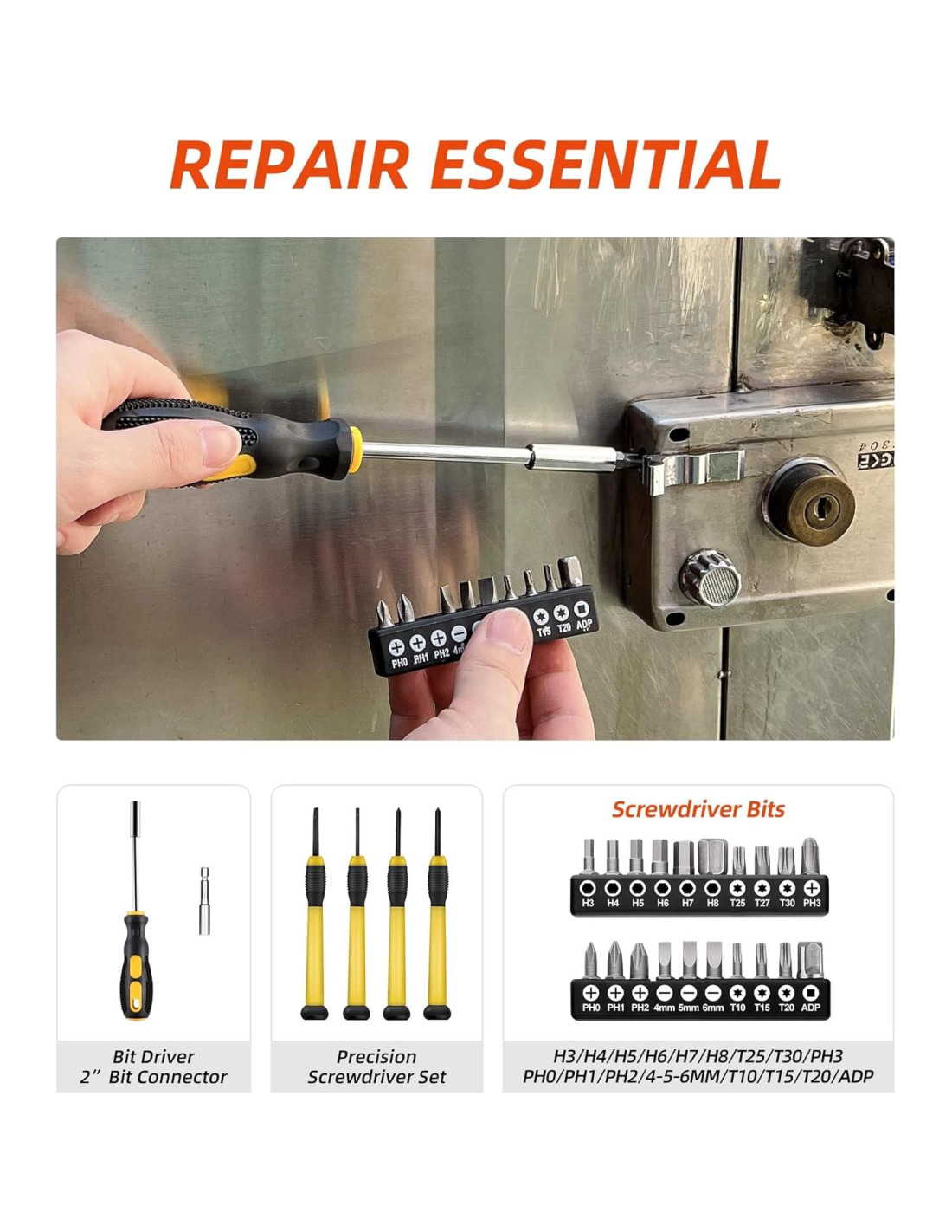 - [Kit de Herramientas Multifuncional] - El conjunto incluye cinta métrica, martillo de garra, alicates de junta deslizante, destornillador de punta, conector de punta, tijeras, cortador de utilidad, destornillador de precisión, llave hexagonal y puntas de destornillador.