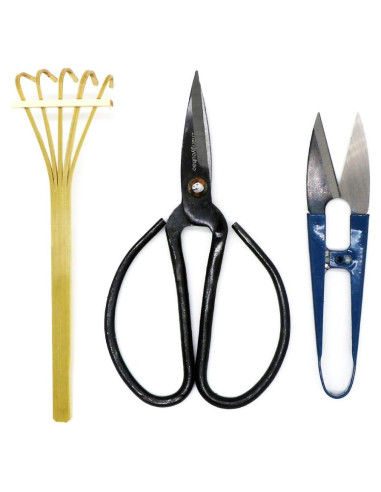 Kit de Herramientas para Podar y Recortar Bonsai Kebinfen - Tijeras de Podar, Tijeras de Bonsai para Brotes y Hojas, Rastrillo de Bambú - Set de 3 Rastrillo de Bambú - Longitud 5" (12,7 cm), hecho a mano de bambú natural. El rastrillo de bambú cuenta con espacios ajustables. Tijeras de podar bonsai - longitud 5" (12,7 cm), afiladas y cortan con facilidad, lo que las hace perfectas para podar, cortar ramitas u otras ramas pequeñas. Recortador de Brotes y Hojas - Material de la hoja: Acero al Carbono de Alta Calidad, Longitud de las Tijeras de Bonsai 4" (10,16 cm), Color: mango con recubrimiento azul, las tijeras de precisión son útiles cuando necesitas hacer cortes precisos. Este Kit de Podas para Bonsai es perfecto tanto para principiantes como para entusiastas maestros del bonsai. El paquete incluye: 1x Kit de Podas para Bonsai (Tijeras de Podar x1, Tijeras de Bonsai para Brotes y Hojas x1, Rastrillo de Bambú x1) Ten en cuenta que una pequeña cantidad de aceite en las tijeras es una protección normal.