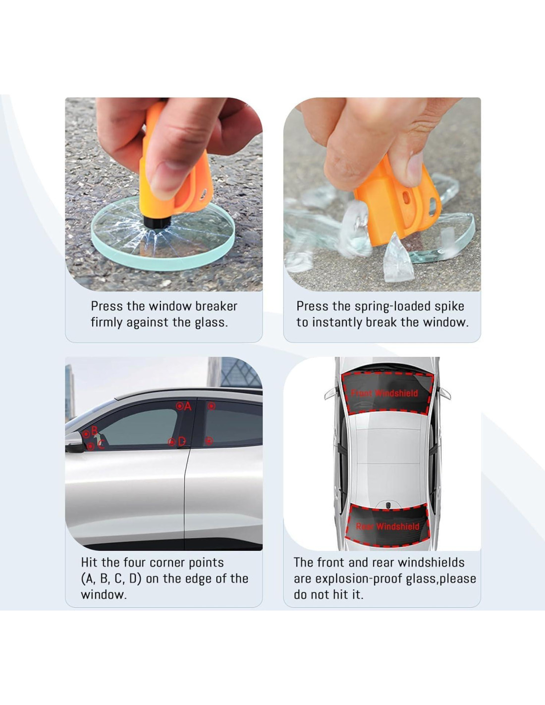 - ROMPEDOR DE VENTANAS CON CORTADOR DE CINTURÓN El sólido y resistente pico de acero inoxidable rompe fácilmente los cristales templados de las ventanas laterales del coche. Golpea preferiblemente una de las esquinas de la ventana. Está equipado con un mecanismo de resorte. Se reinicia automáticamente después de cada uso. La hoja de acero inoxidable incrustada permite cortar un cinturón de seguridad atascado en poco tiempo. Corta el cinturón de seguridad en diagonal para un corte rápido y limpio. Viene con una carcasa protectora para evitar lesiones accidentales y se puede usar múltiples veces.