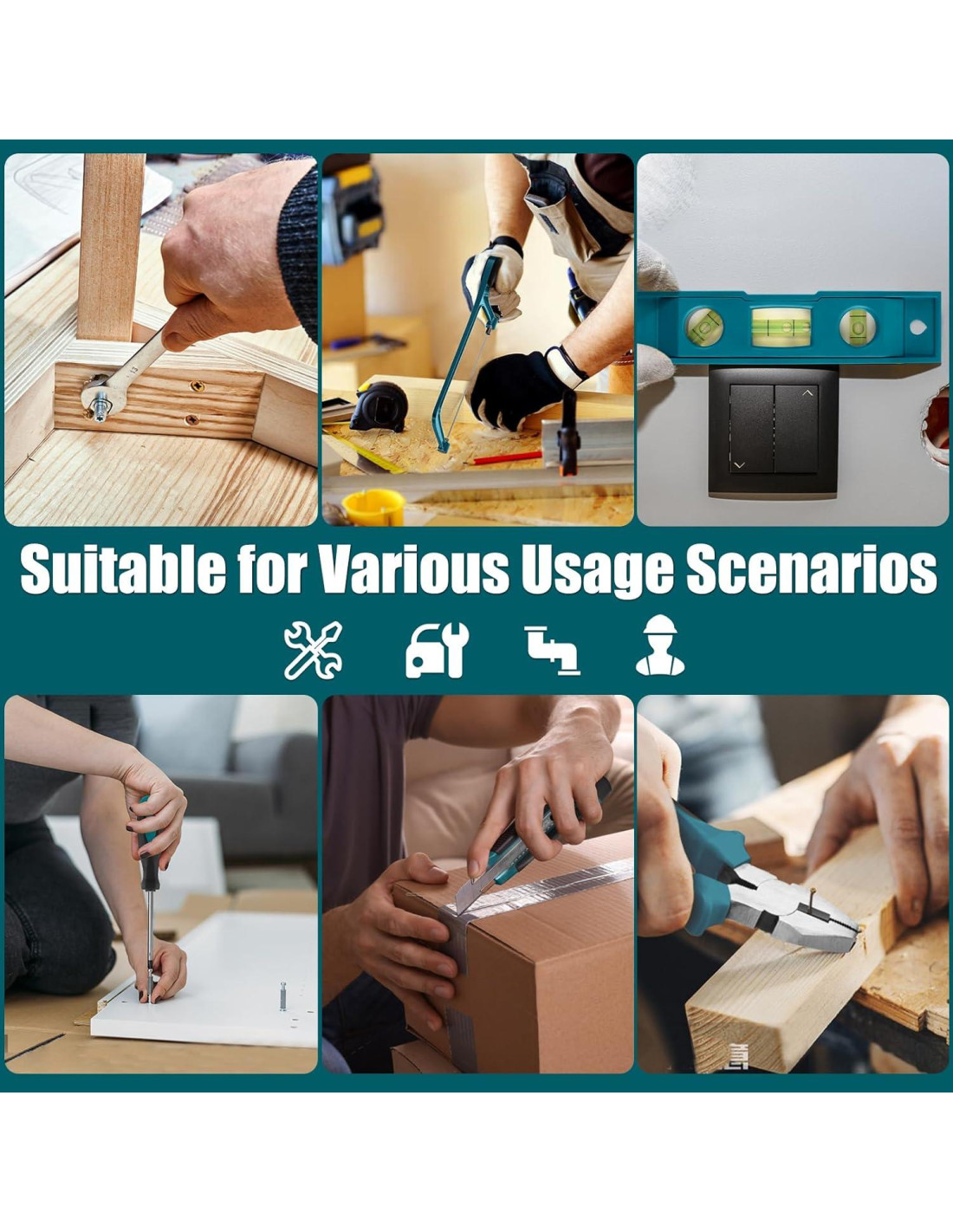 - Juego Completo de Kit de Herramientas de Mano Este kit de herramientas compacto contiene herramientas y equipos de mecánico que incluyen llaves, juego de destornilladores para el hogar, cinta aislante, portabits de trinquete, barra de extensión, sockets métricos, juego de llaves, bits de destornillador, lápiz de prueba eléctrico, nivel de burbuja, bits de tornillo, bujía, cinta métrica, sockets de transferencia, paquete de tornillos surtidos, martillo, juego de alicates, cortador, hoja de herramienta múltiple, bridas de plástico, sierra manual, hojas de sierra, juego de tornillos y tacos de pared y muchas otras herramientas