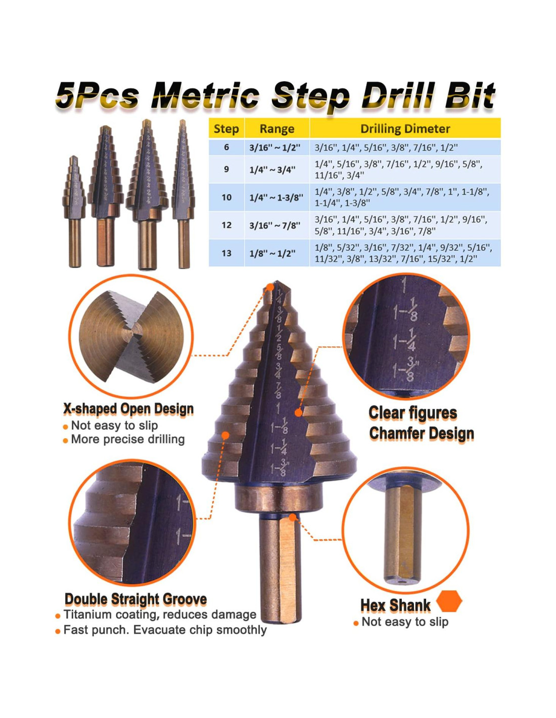 - Paquete de 5 Brocas de Escalonado con Recubrimiento de Titanio HSS: 3/16-1/2'' (0,48-1,27 cm), 1/8-1/2'' (0,32-1,27 cm), 1/4-3/4'' (0,64-1,90 cm), 3/16-7/8'' (0,48-2,22 cm), 1/4-1-3/8'' (0,64-3,49 cm), adecuado para metal en lámina, tablero de madera, plástico, aleación de aluminio, cobre, NO recomendado para acero de alto carbono, metal duro.