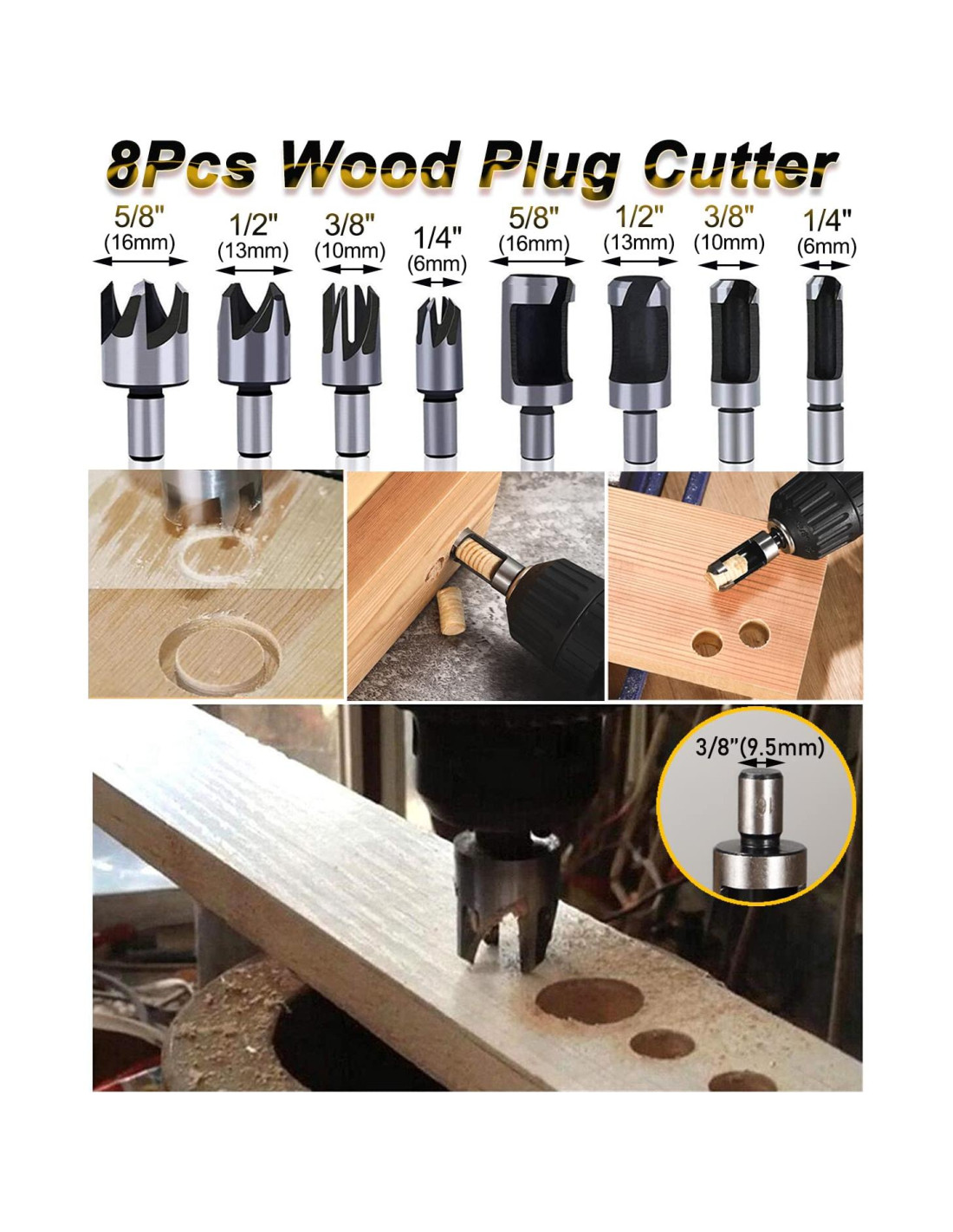 - Paquete de 8 Brocas de Cortador de Tapones de Madera de 3/8" (0,95 cm) - Hechas de acero al carbono duradero, se utilizan para tapones cónicos de 1/4" (0,64 cm), 3/8" (0,95 cm), 1/2" (1,27 cm), 5/8" (1,59 cm) para cubrir agujeros de tornillos empotrados o ocultar imperfecciones. Puede cortar el tapón a 22mm/23mm/25mm/26mm de profundidad.