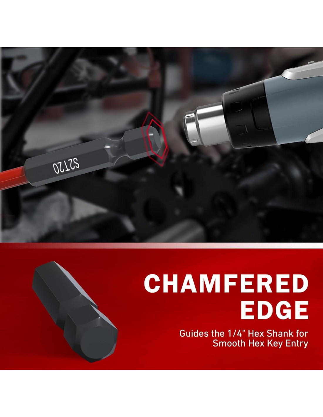 - Vástago Hexagonal de 1/4" Versátil para Uso Universal: Con un vástago hexagonal estándar de 1/4 de pulgada, este juego es compatible con una amplia gama de herramientas, incluyendo destornilladores de impacto, taladros eléctricos y destornilladores manuales. Ideal para reparaciones automotrices, trabajos en madera, mantenimiento del hogar, electrónica y tareas profesionales de alta resistencia.
