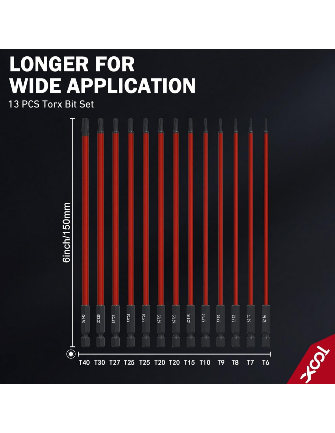- Diseño Extra Largo de 6 Pulgadas para Alcance Profundo: Con una longitud de 6 pulgadas (150mm), estas puntas Torx son ideales para acceder a tornillos en espacios difíciles de alcanzar o estrechos, como compartimentos de motor profundos, tableros de instrumentos y ensamblaje de muebles. La longitud extendida elimina la frustración de las puntas cortas que se deslizan o que no pueden alcanzar.