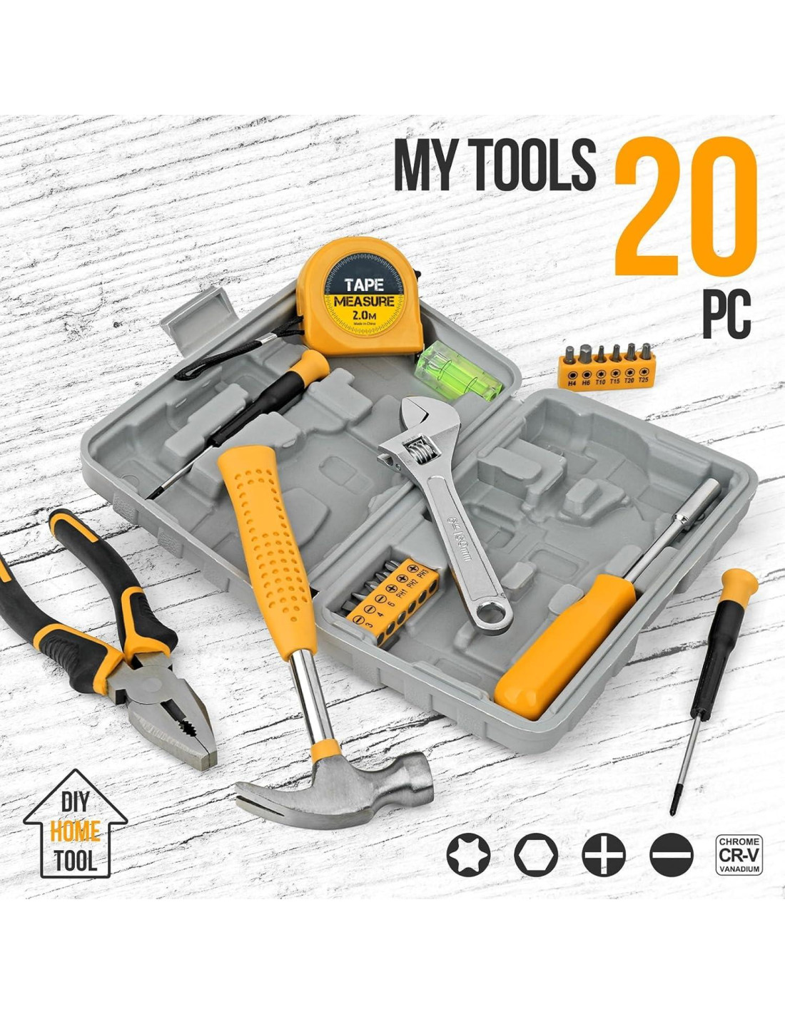 - INCLUYE HERRAMIENTAS BÁSICAS: El pequeño kit de herramientas incluye un martillo, una llave ajustable, un par de alicates, una cinta métrica, un nivel, dos destornilladores pequeños y un destornillador de múltiples puntas (incluye 3 de cabeza Phillips, 3 de cabeza plana, 4 de cabeza en flor y 2 de cabeza hexagonal).