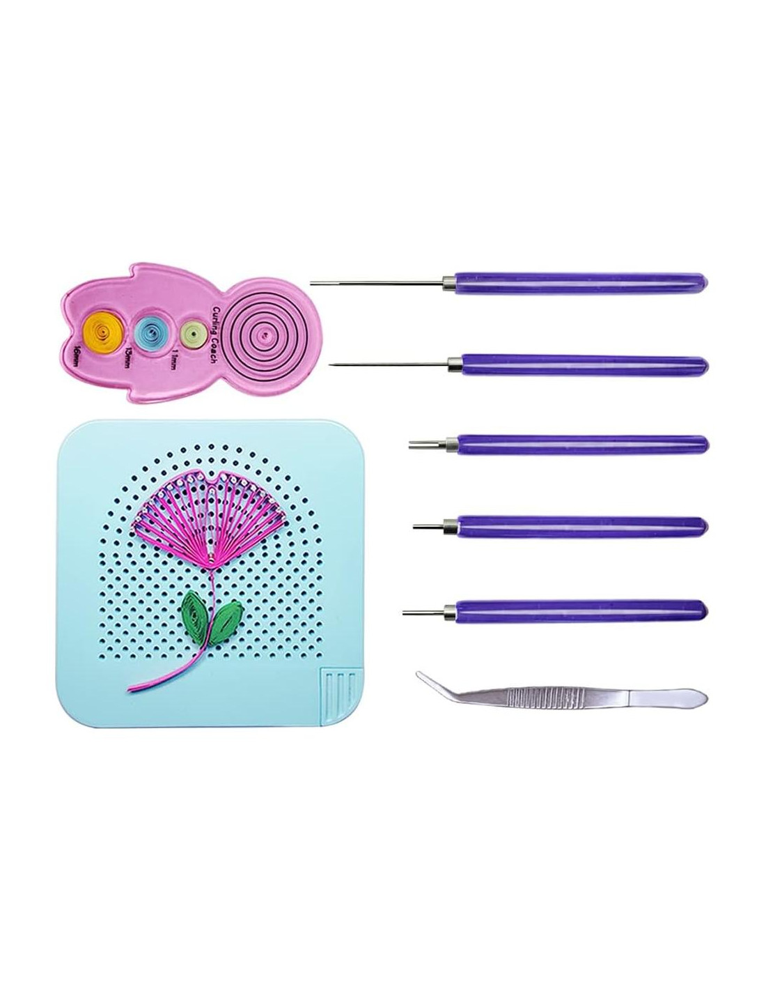 - 1. PAQUETE INCLUIDO: Obtendrás 1 Pc Tabla de Tejer Quilling con Caja de Almacenamiento de Pines, 5 Pcs plumas de aguja ranurada moradas, 1 Pc entrenador de enrollado, 1 pinzas. Total 8 Piezas.
