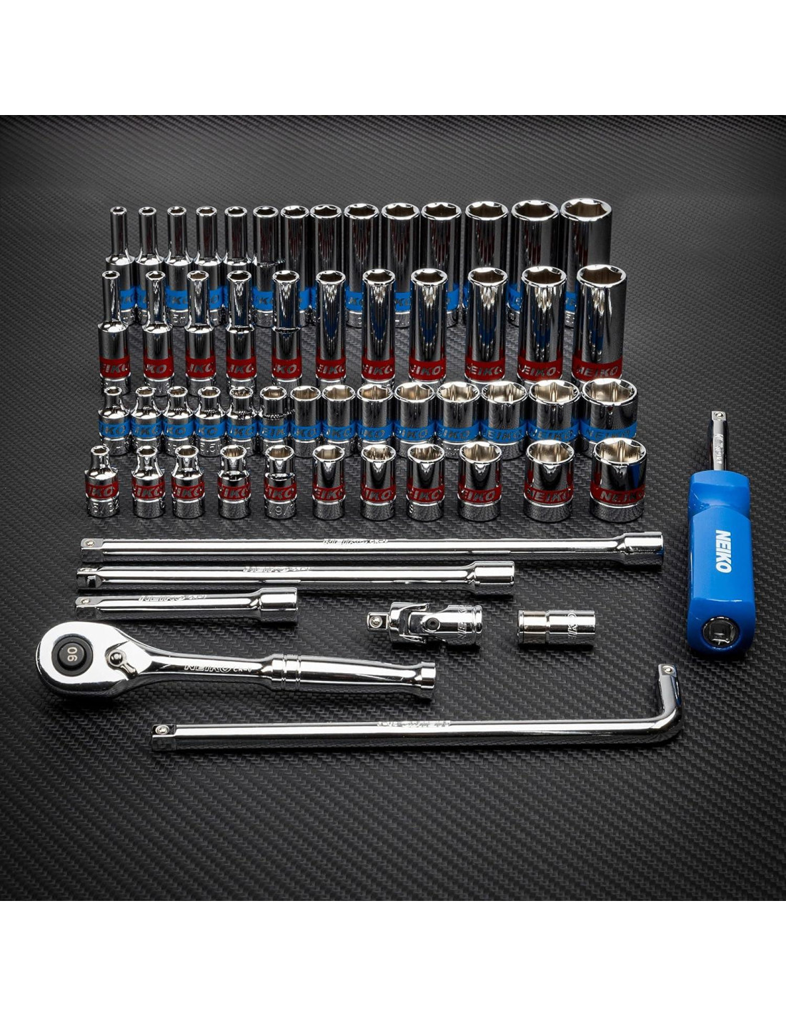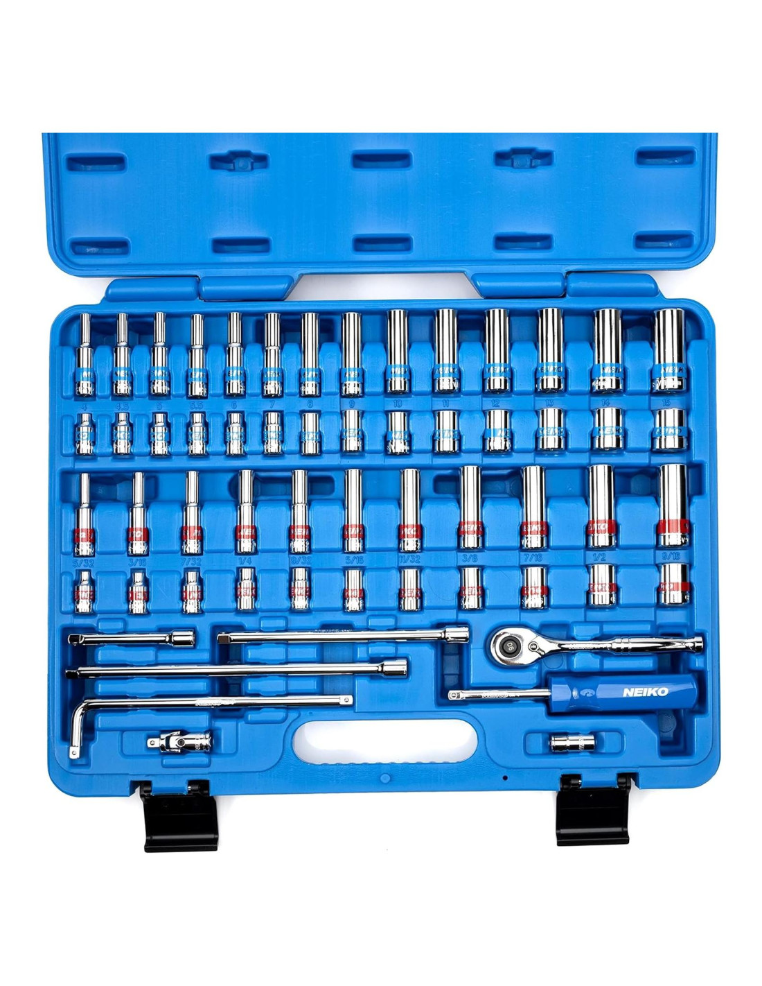 NEIKO presenta nuestro Juego de Carraca y Enchufes de 1/4 de Pulgada para satisfacer todas tus necesidades de enchufes. Este kit todo en uno de 58 piezas incluye tamaños de enchufes métricos y SAE, tanto superficiales como profundos. Cada pieza de este juego de llave de carraca y enchufes está hecha de acero de cromo vanadio para durar años de uso y tiene un acabado cromado para un aspecto profesional que es fácil de limpiar. Un diseño de enchufe de 6 puntos permite que cada enchufe se ajuste de manera segura a las cabezas de los sujetadores en forma de hexágono y previene el redondeo para mantener tus tuercas y tornillos en excelente estado. Los enchufes también están codificados por colores para facilitar la elección del que necesitas. Este juego de enchufes estándar y métricos también incluye una carraca de 1/4 de pulgada de 7" (17.78 cm), una extensión en forma de L, una junta universal, barras de extensión de 3 pulgadas (7.62 cm), 6 pulgadas (15.24 cm) y 8 pulgadas (20.32 cm), un mango giratorio de 1/4" (mango de destornillador), un adaptador de broca de 1/4" y una caja de transporte. Este conjunto incluye los siguientes tamaños métricos superficiales y profundos: 4, 4.5, 5, 5.5, 6, 7, 8, 9, 10, 11, 12, 13, 14 y 15 mm. También incluye los siguientes tamaños SAE superficiales y profundos: 5/32", 3/16", 7/32", 1/4", 9/32", 5/16", 11/32", 3/8", 7/16", 1/2" y 9/16". Ya sea que necesites un nuevo juego de herramientas automotrices o solo algunos nuevos accesorios de enchufe, NEIKO tiene tu respaldo con nuestras herramientas duraderas, confiables y fuertes.