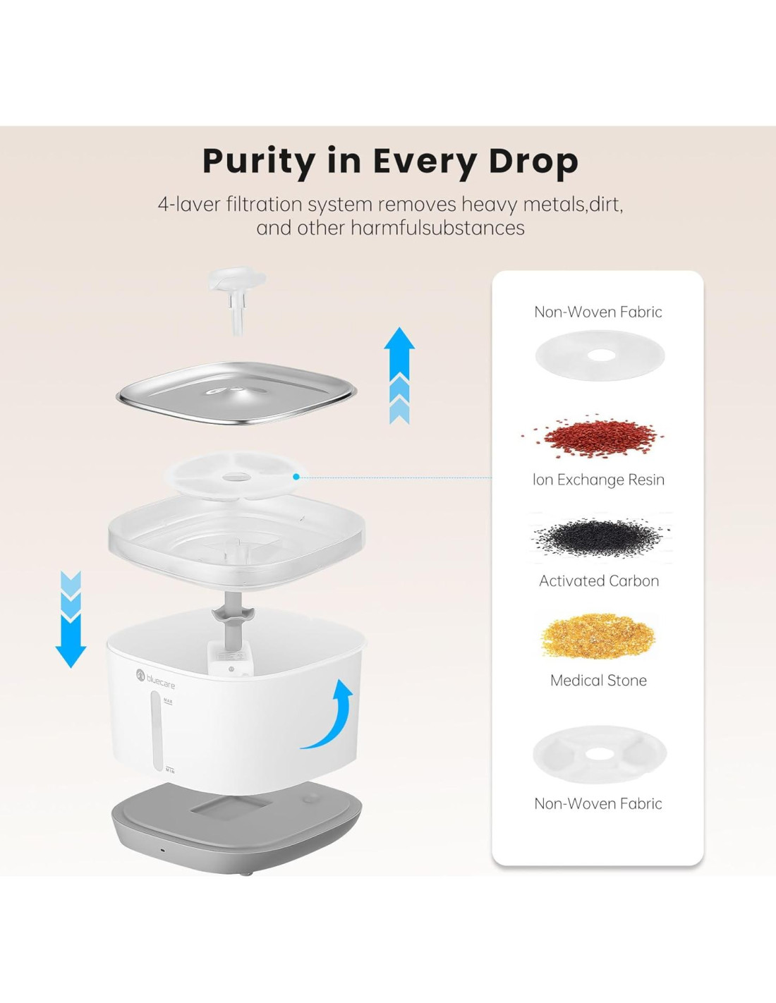 - [Sistema de Filtración Vertical] Cada gota de agua se filtra a través de una filtración de múltiples capas para eliminar todas las impurezas y proporcionar agua enriquecida con oxígeno y de mejor sabor. 1. El carbón activado elimina el mal sabor y olor 2. La resina de intercambio iónico puede ablandar el agua del grifo 3. La piedra médica elimina metales pesados y libera elementos traza 4. La tela no tejida puede filtrar pelo e impurezas 5. La esponja de alta densidad de la bomba ayuda a eliminar partículas finas.