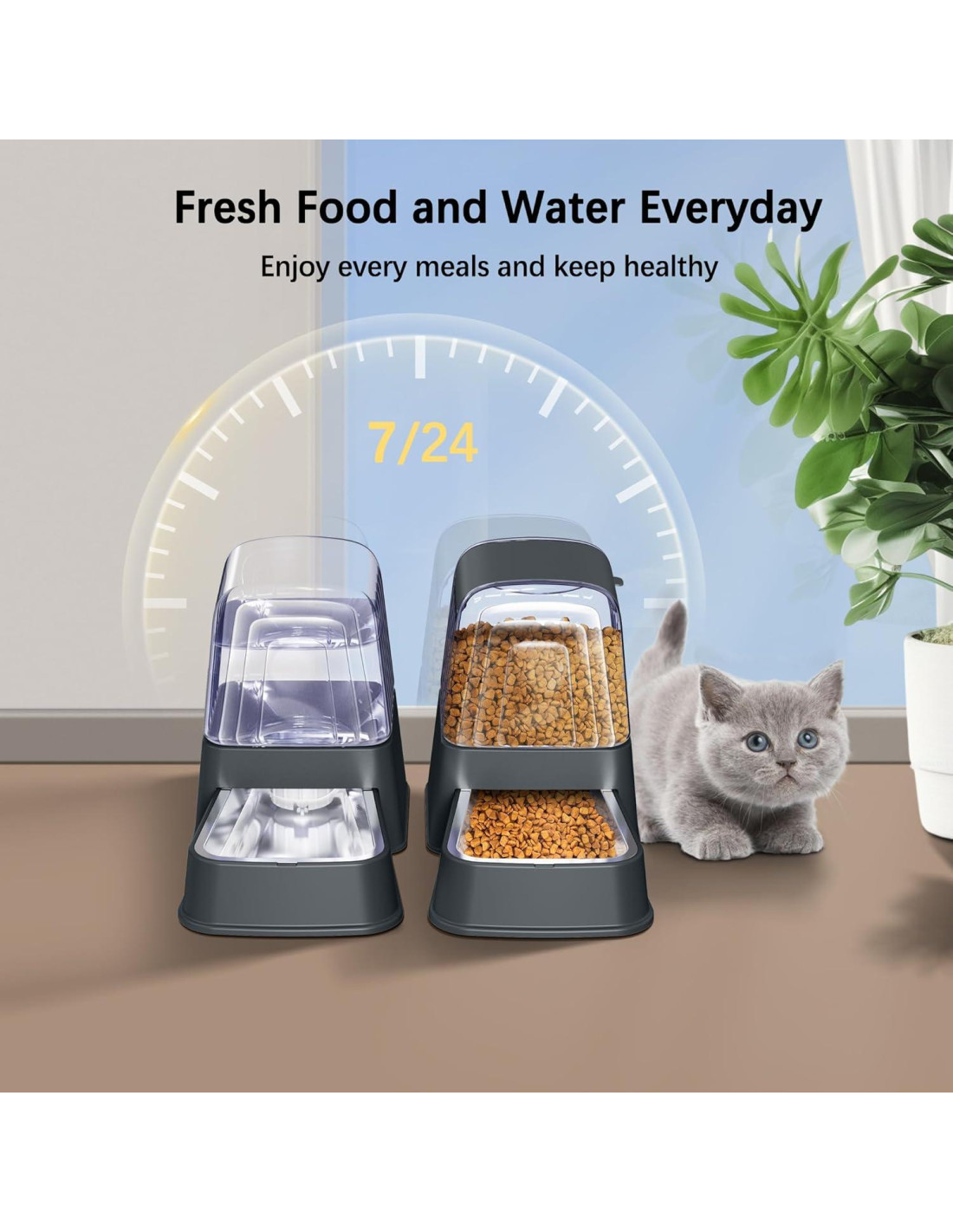 - Comer y beber de forma segura: Nos preocupamos por la salud de las mascotas. El tazón de comida y el tazón de agua del dispensador automático para gatos están hechos de acero inoxidable 304 de grado alimenticio, y el tazón está completamente unido a la base. Además, otros componentes son materiales amigables para mascotas, libres de BPA. El dispensador para gatos es lo suficientemente seguro para tus mascotas