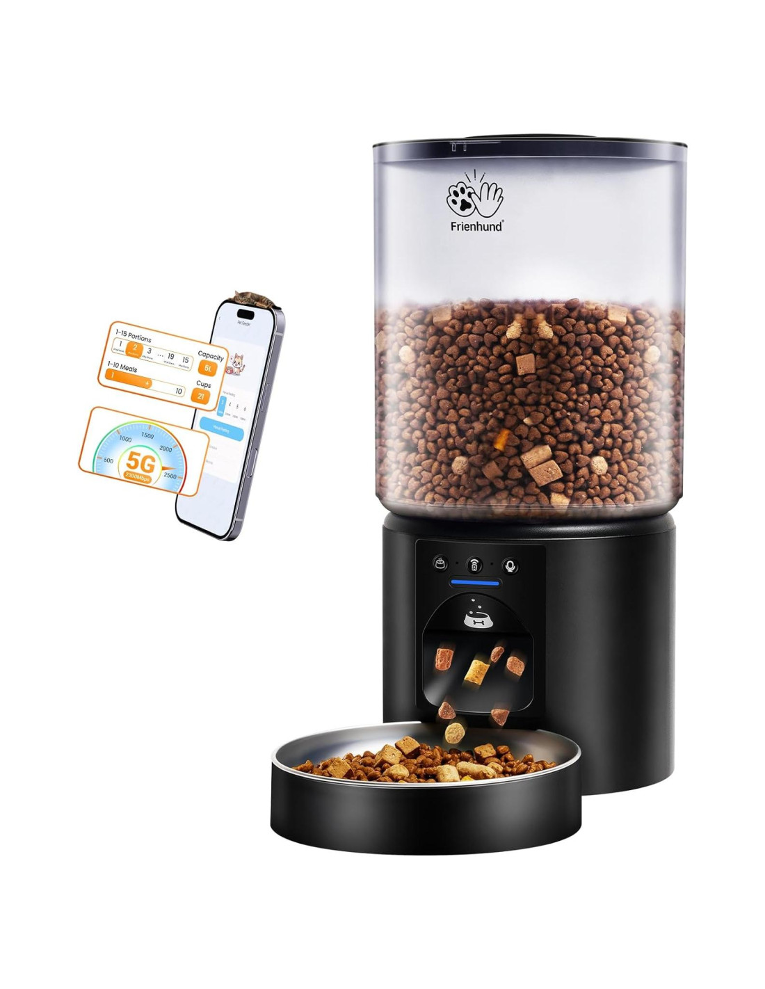 - WiFi de Doble Banda: El comedero automático para perros Frienhund soporta WiFi de doble banda (2.4GHz y 5GHz). WiFi de doble banda significa que no tienes que modificar tu router por problemas de compatibilidad de canales. Las redes 5G más rápidas permiten una señal más estable.