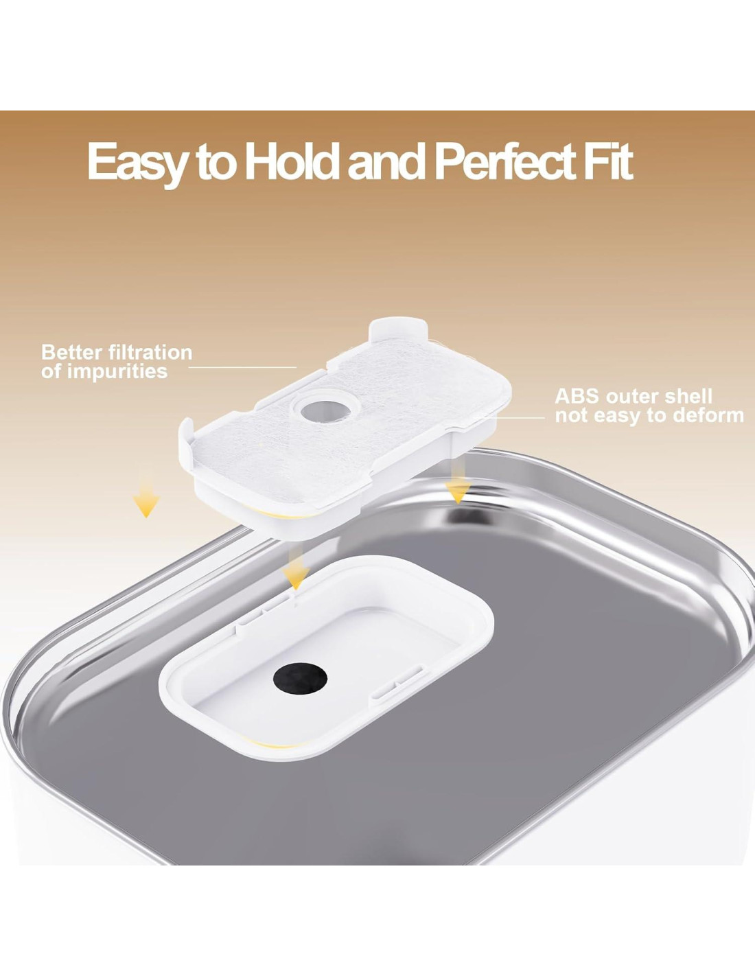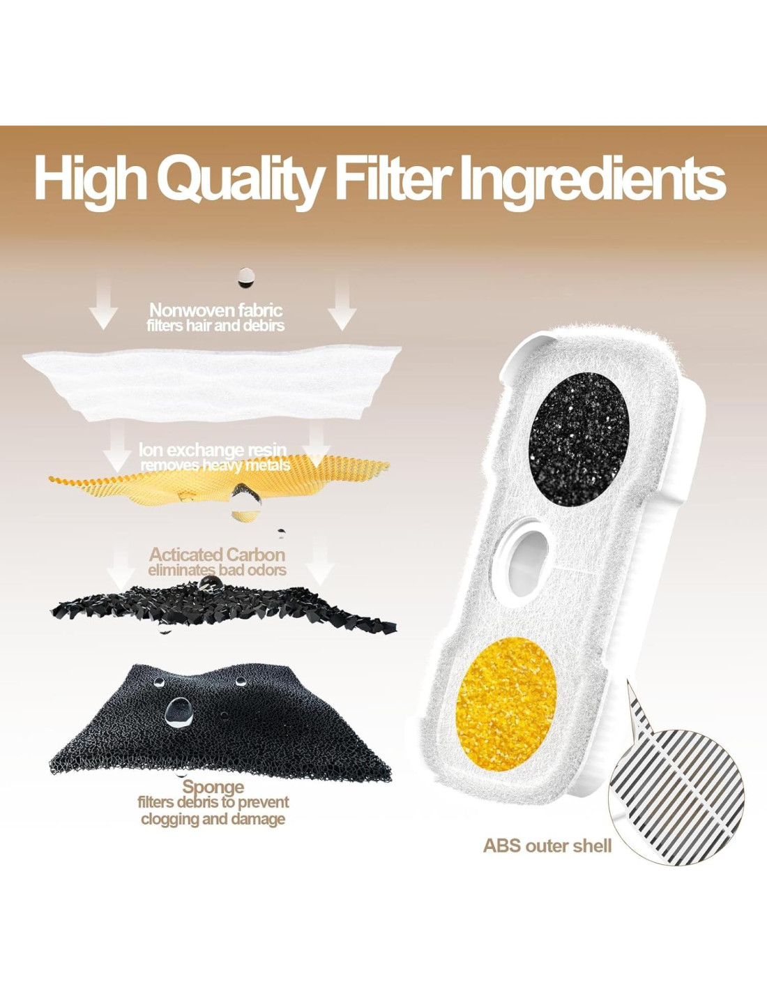 - Filtros de Reemplazo de Filtración de 4 Capas: 1. El carbón activado elimina olores 2. La resina de intercambio iónico elimina iones de metales pesados y ablanda el agua 3. La tela no tejida atrapa el pelo de gato y las impurezas 4. La esponja de bomba incorporada filtra aún más los desechos y previene obstrucciones y daños. Proporciona agua potable limpia y fresca para tu mascota.