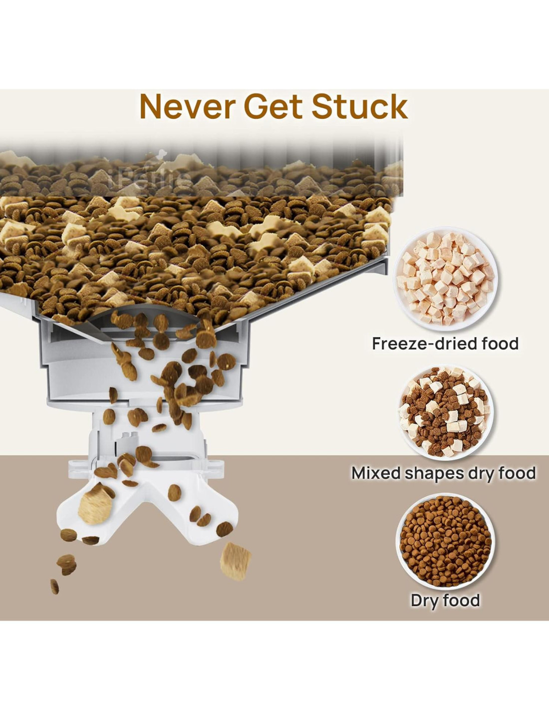 - Nunca Te Quedes Atascado: Equipado con un motor de gran torque, este comedero automático dual para gatos elimina el problema de atascos de comida y comidas perdidas. Usa solo croquetas secas o comida liofilizada entre 0.12"-0.51" (3mm-13mm) de tamaño para obtener los mejores resultados.