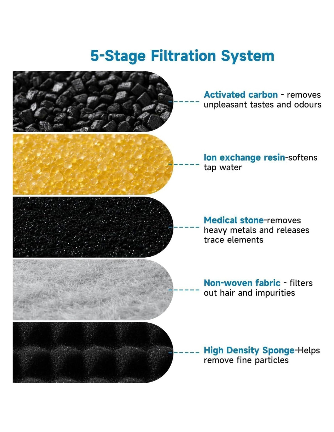 - [Sistema de Filtración de Alta Calidad] El sistema de filtración de 5 etapas proporciona continuamente a su mascota agua fresca y saludable. El carbón activado elimina olores y sabores desagradables. La resina de intercambio iónico ablanda el agua del grifo. La piedra de grado médico elimina metales pesados y libera elementos traza. La tela no tejida filtra el pelo y las impurezas. La esponja de alta densidad de la bomba ayuda a eliminar partículas finas.