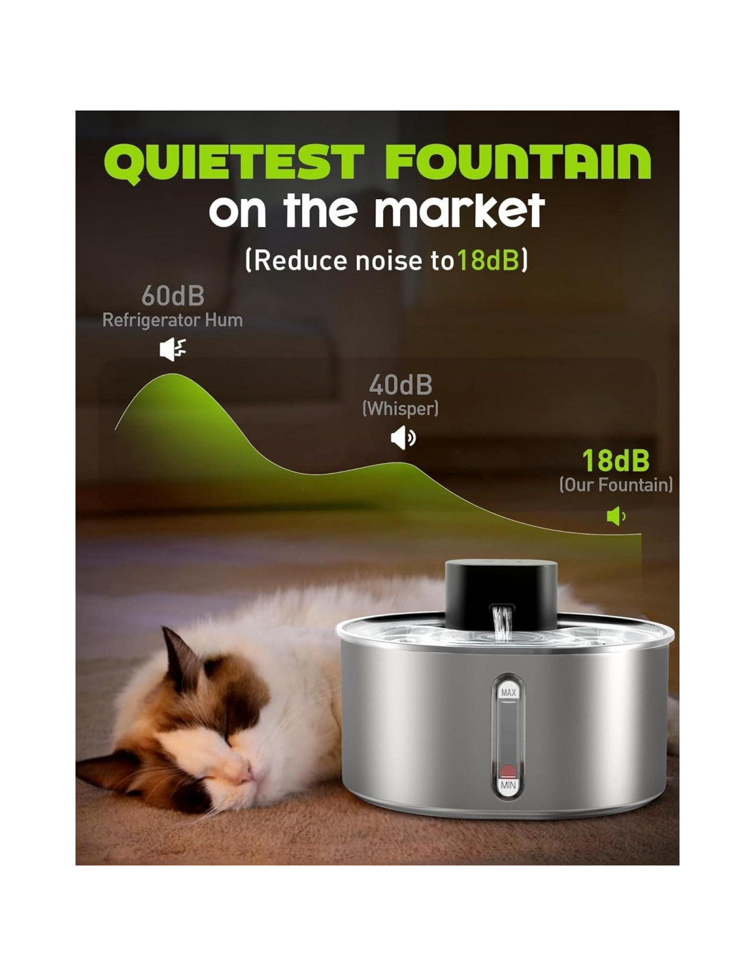 - Super Silenciosa: Gracias a su diseño sin bomba, la fuente de agua para gatos inalámbrica y su flujo de agua generan un ruido mínimo durante la operación. Este rendimiento silencioso proporciona una experiencia cómoda para sus mascotas. La fuente de agua para gatos de acero inoxidable inalámbrica emite un nivel de ruido tan bajo como 18dB, que es apenas audible. Esto significa que tanto usted como su mascota pueden disfrutar de un sueño ininterrumpido por la noche. Además, por razones de seguridad, la fuente de agua para gatos inalámbrica está diseñada para apagarse automáticamente cuando el nivel de agua desciende demasiado.