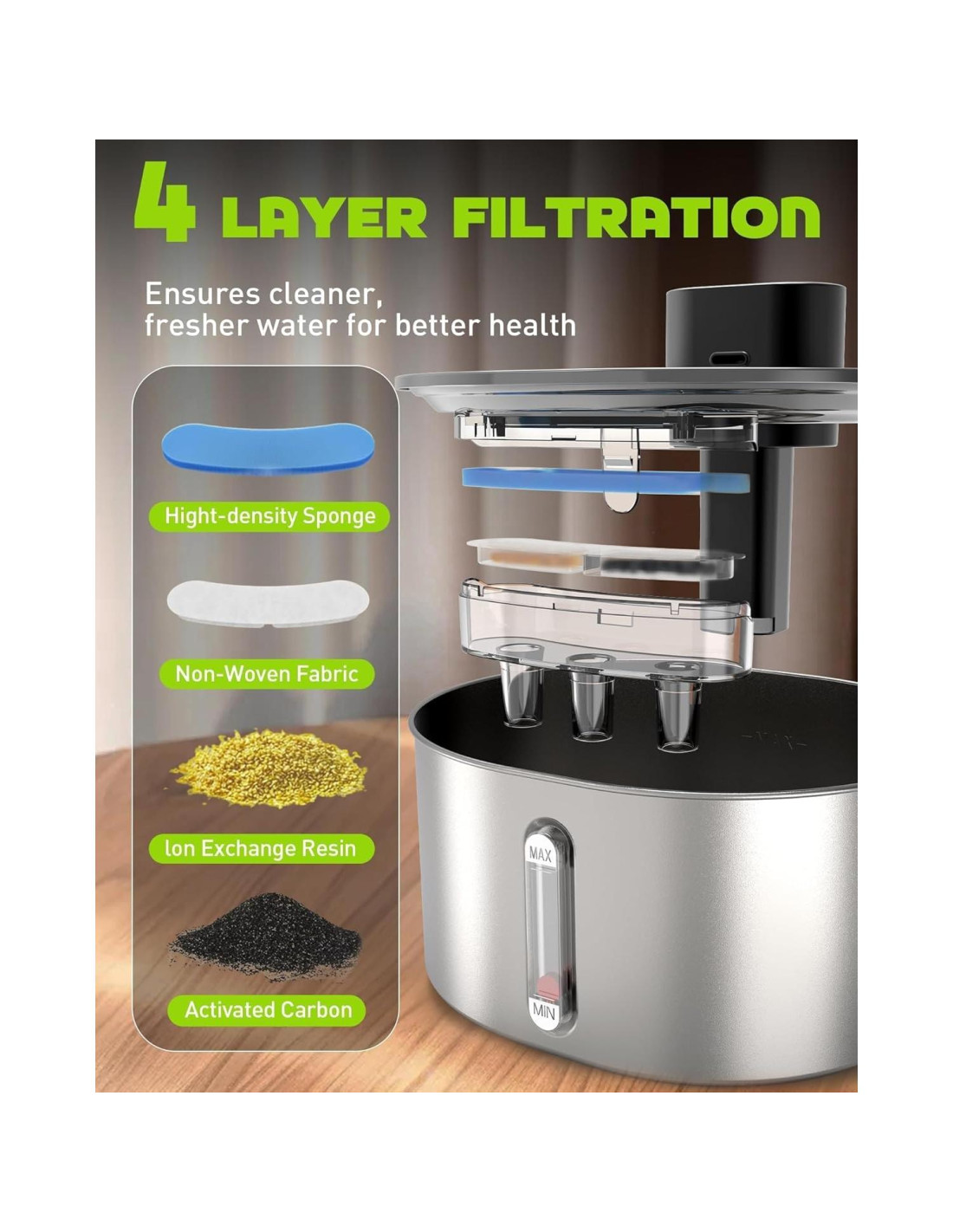 - Más Pura Que Nunca: Con esta fuente de agua para gatos sin cable, sus mascotas pueden tener acceso a agua fresca y limpia en cualquier lugar que deseen. Cada gota de agua pasa a través de un sistema de filtración de múltiples capas que elimina efectivamente todas las impurezas, resultando en agua rica en oxígeno con un sabor mejorado. Para salvaguardar la salud de su mascota, se recomienda cambiar los filtros cada dos semanas y limpiar la fuente de agua para mascotas a batería al menos una vez a la semana. (por favor, contacte al vendedor para filtros y adaptador)