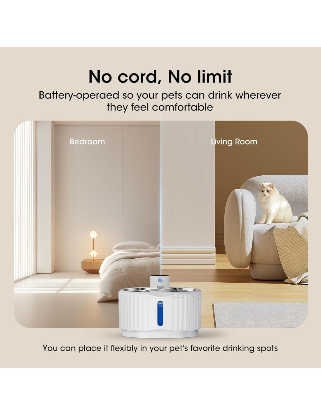 - Diseño Inalámbrico a Batería: Di adiós a los cables enredados, permitiendo que tu mascota disfrute de agua fresca y limpia en cualquier lugar. Previene eficazmente que las mascotas muerdan los cables. Puedes colocarlo de manera flexible en los lugares favoritos de tu mascota para beber.