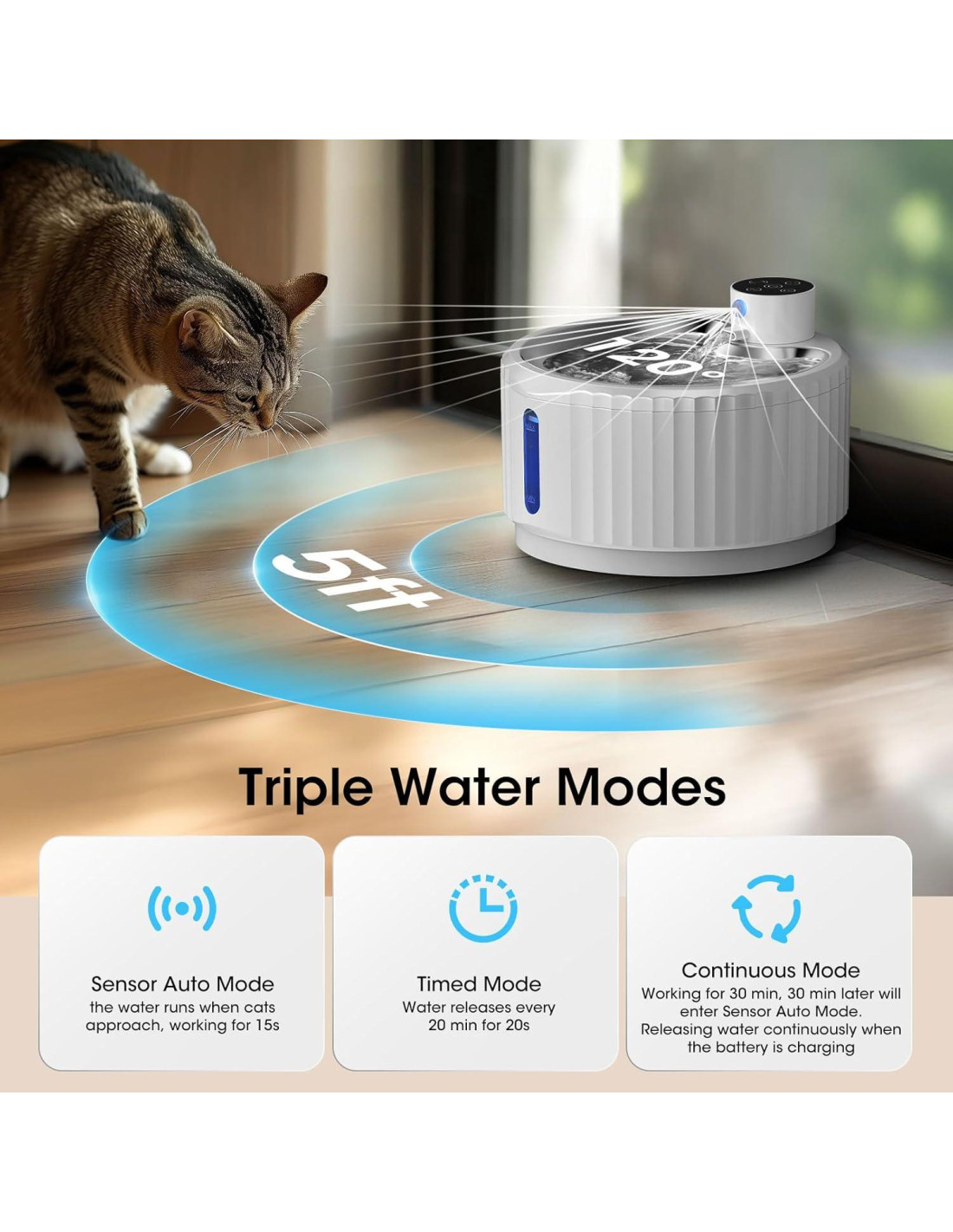 - Tres Modos de Agua: 1. Modo Continuo: Descarga continua de agua durante 30 minutos, después de 30 minutos entrará automáticamente en modo de inducción. 2. Modo de Inducción: el agua fluye cuando los gatos se acercan (dentro de 5 pies (1.5 m) y 120), funcionando durante 15 segundos. 3. Modo de Temporizador: el agua se libera cada 20 minutos durante 20 segundos y el ciclo continúa. Puedes elegir uno de ellos según la preferencia de gatos y perros.